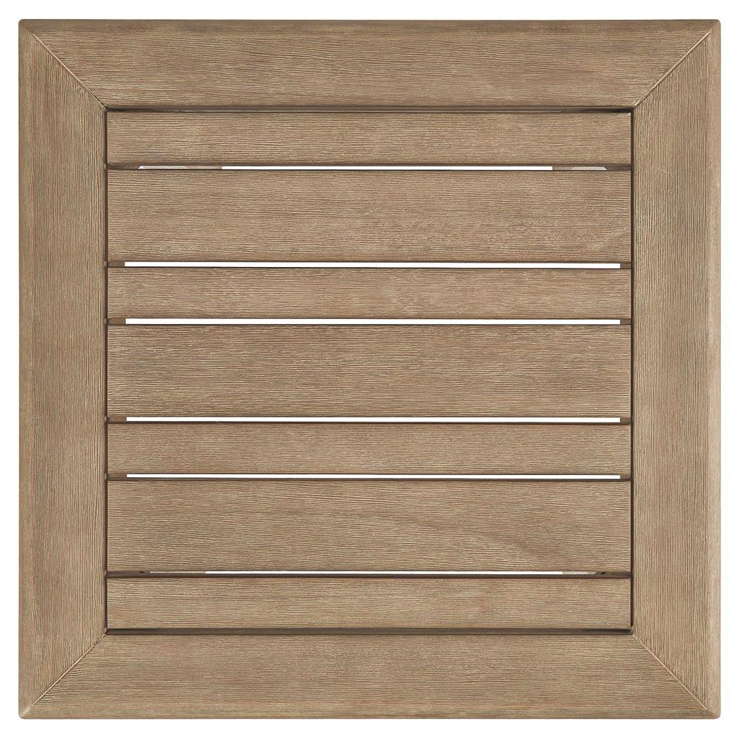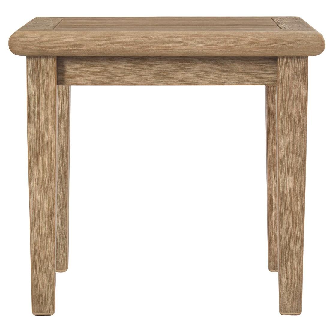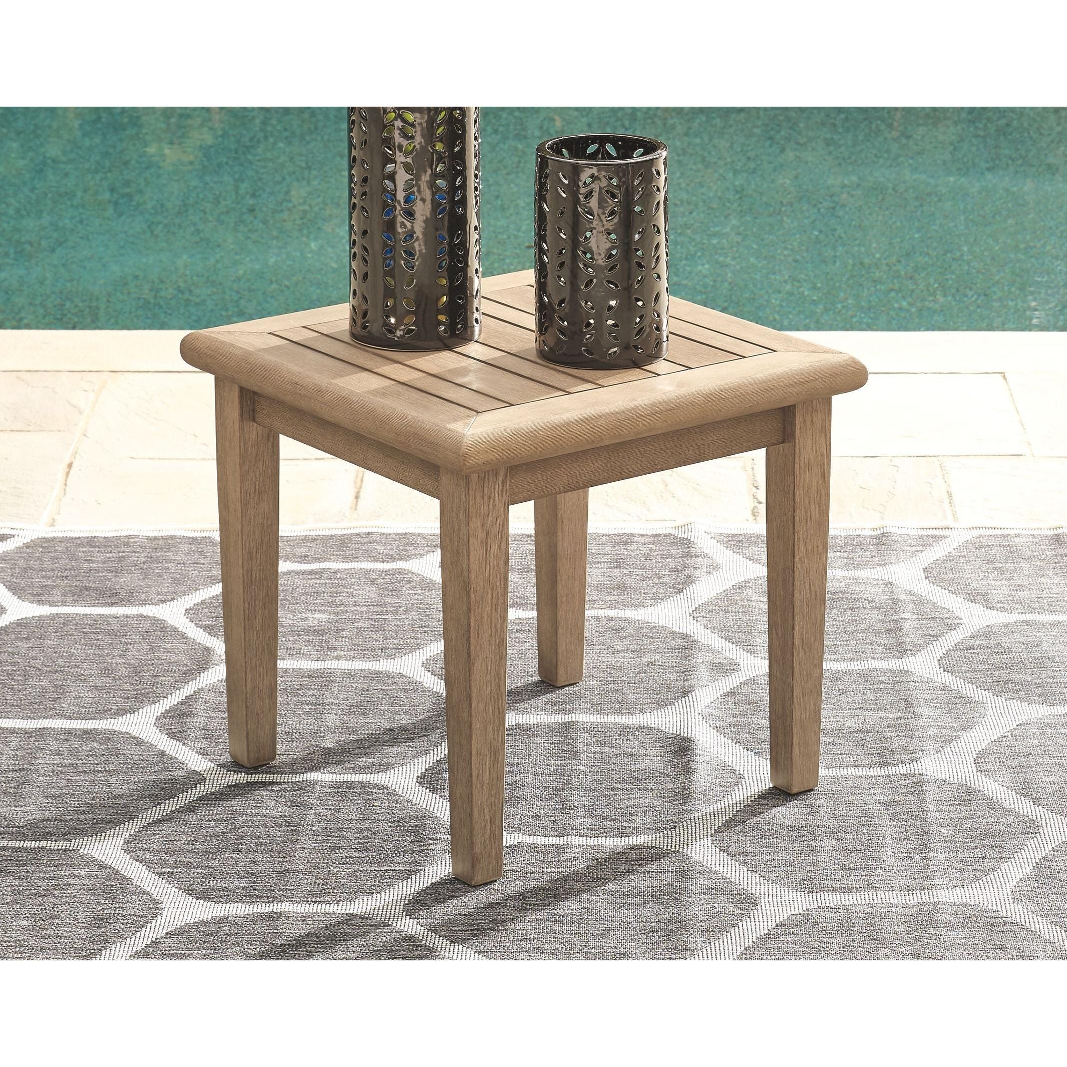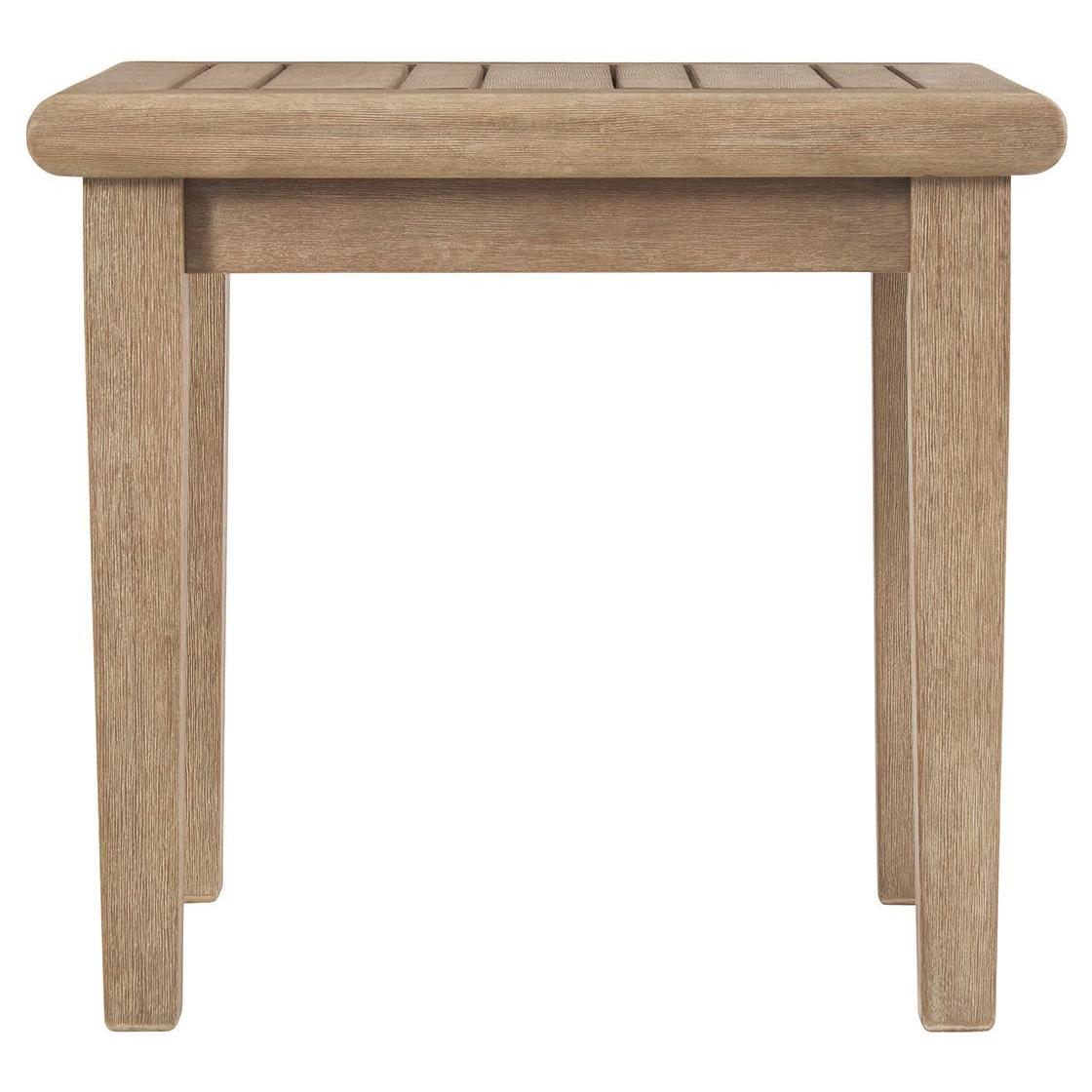 Discover a high style alternative to traditional outdoor furniture. With its antiqued teak-like finish, this solid wood end table definitely has the corner on style. Better yet, it has the edge when it comes to affordability. For that much more weather protection, the table's eucalyptus wood frame with slat styling is treated to a 5-step finishing process.