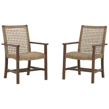 Dream weaver. Round out your indoor or outdoor living space with the naturally beautiful look of wood and wicker. This arm chair will serve up seasons of worry-free dining in your sunroom, on your back deck or sitting pretty poolside. The chair's open-weave design is made from woven resin and eucalyptus wood, for the perfect merger of high fashion and lasting durability.