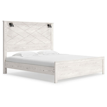 Cool, clean and casually modern. This king panel bed's white rustic finish sets the tone for your calming sanctuary. Matte black sconce lights and an abstract design on the headboard bring a fresh look to the bed's simply stunning profile. White rustic finish with replicated cedar grain accented with rustic gray planked replicated oak grain with authentic touch. Cases feature a framed front and pilasters. Contemporary handles in a dark pewter color finish. Side roller glides for smooth operating drawers. Drawer interiors lined with a replicated linen design for a clean, finished look. Queen (71) and king (72) headboards can attach to a bolt-on metal bed frame B100-31 or B100-66 respectively. Lighted bed option (54,56,57,58,98,99) with an abstract design. Queen and king panel headboards (57,58) feature decorative modern sconce lights in a matte black finish with champagne colored accents. Sconce dimension: 8"W x 5"D x 4.75"H. Safety is a top priority, clothing storage units are designed to meet the most current standard for stability, ASTM F 2057 (ASTM International). Drawers extend out to accommodate maximum access to drawer interior while maintaining safety.