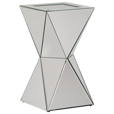 Dynamic yet sophisticated, this accent table is sure to make a statement. The geometric design constructed of beveled mirror is unique and contemporary. Metallic beads add a glitzy touch, making this accent table the perfect small addition to elevate any room.