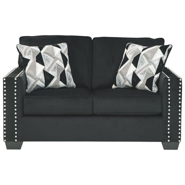 Raise your standard of living with this oveseat in onyx black. Reserved exclusively for those with a penchant for high-glam home decor, this ultra-chic loveseat is dressed to impress with a clean-lined profile, 2-over-2 cushion styling and sleek track arms punctuated with nailhead trim. Easy on the eyes and alluring to the touch, this decidedly contemporary loveseat is covered in a low-pile soft velvet that's impossible to resist. Abstract-patterned throw pillows enhance the posh appeal.