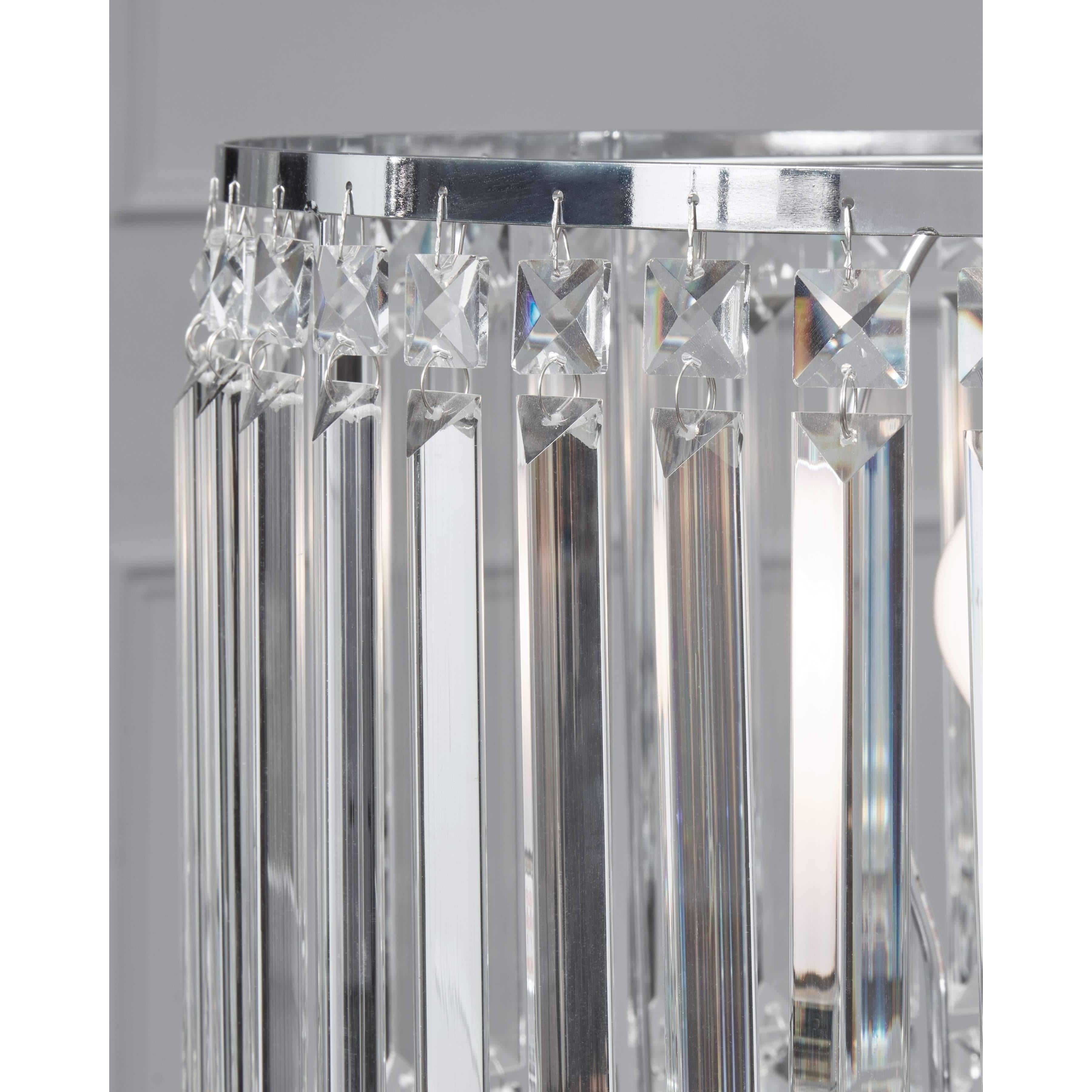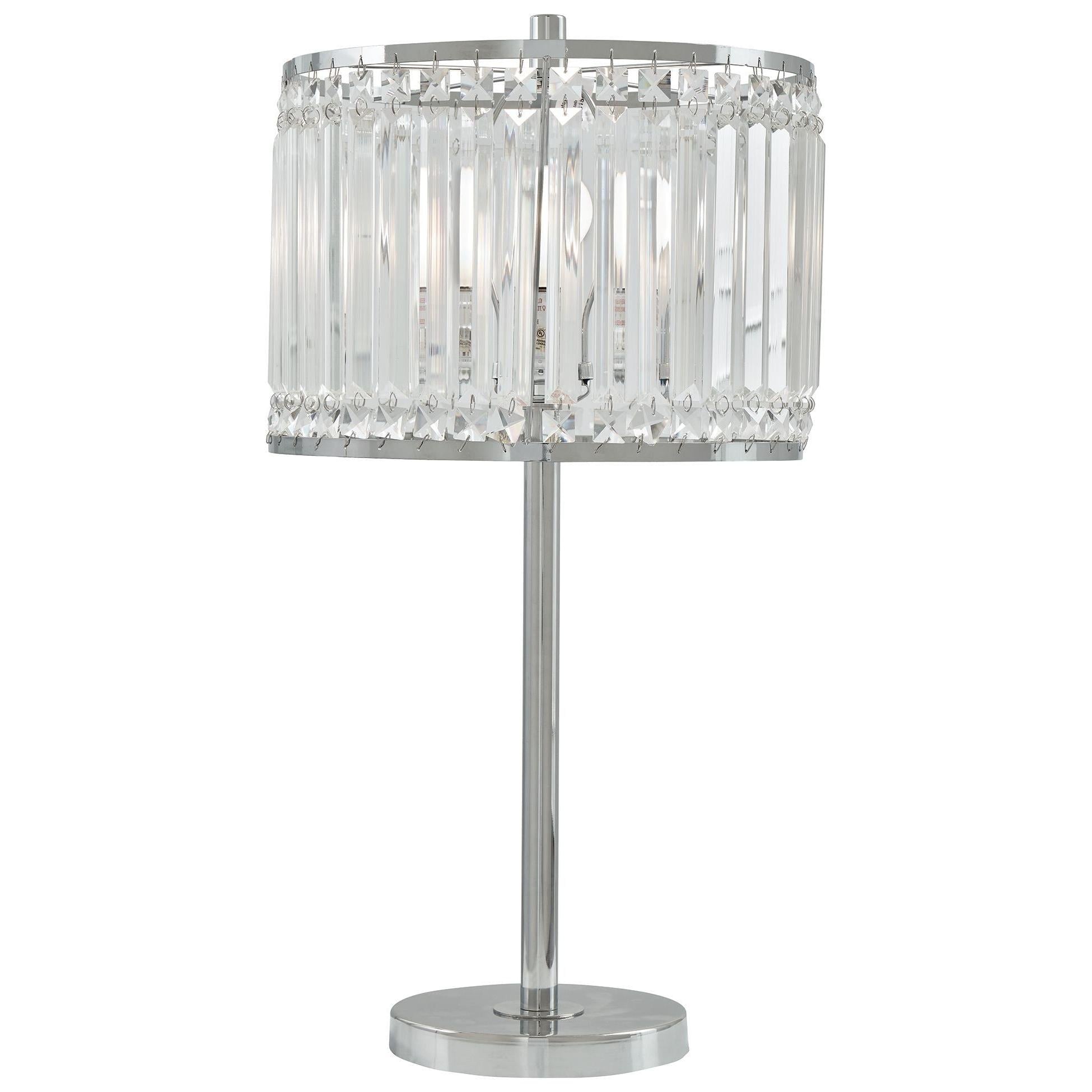 Add glamour and bling to your life with this slim-bodied metal table lamp. A chic addition to modern and contemporary aesthetics, it showcases a polished chrome-tone finish, a round base and a showstopping crystal-beaded drum shade that casts a radiant display when lit.