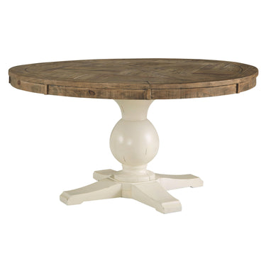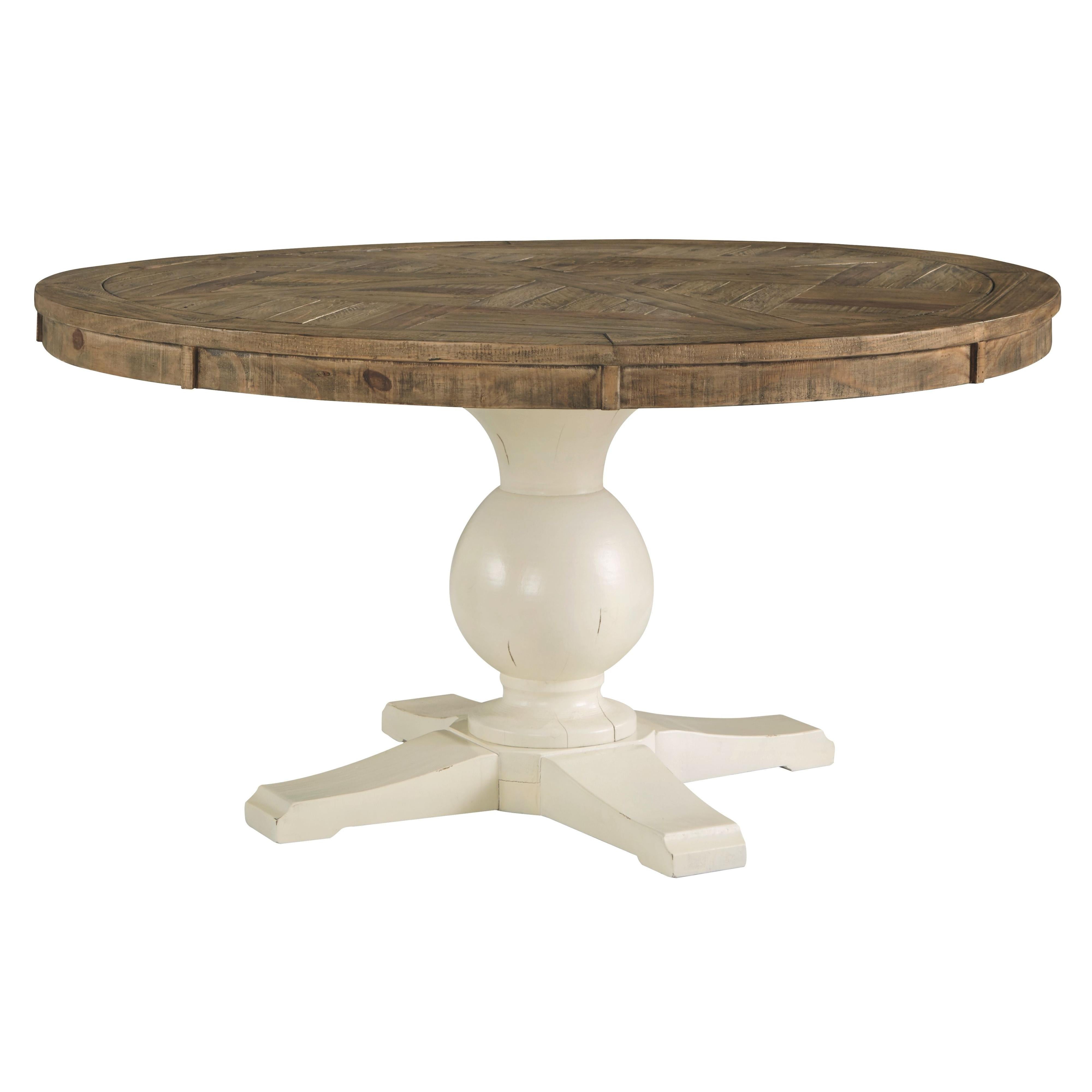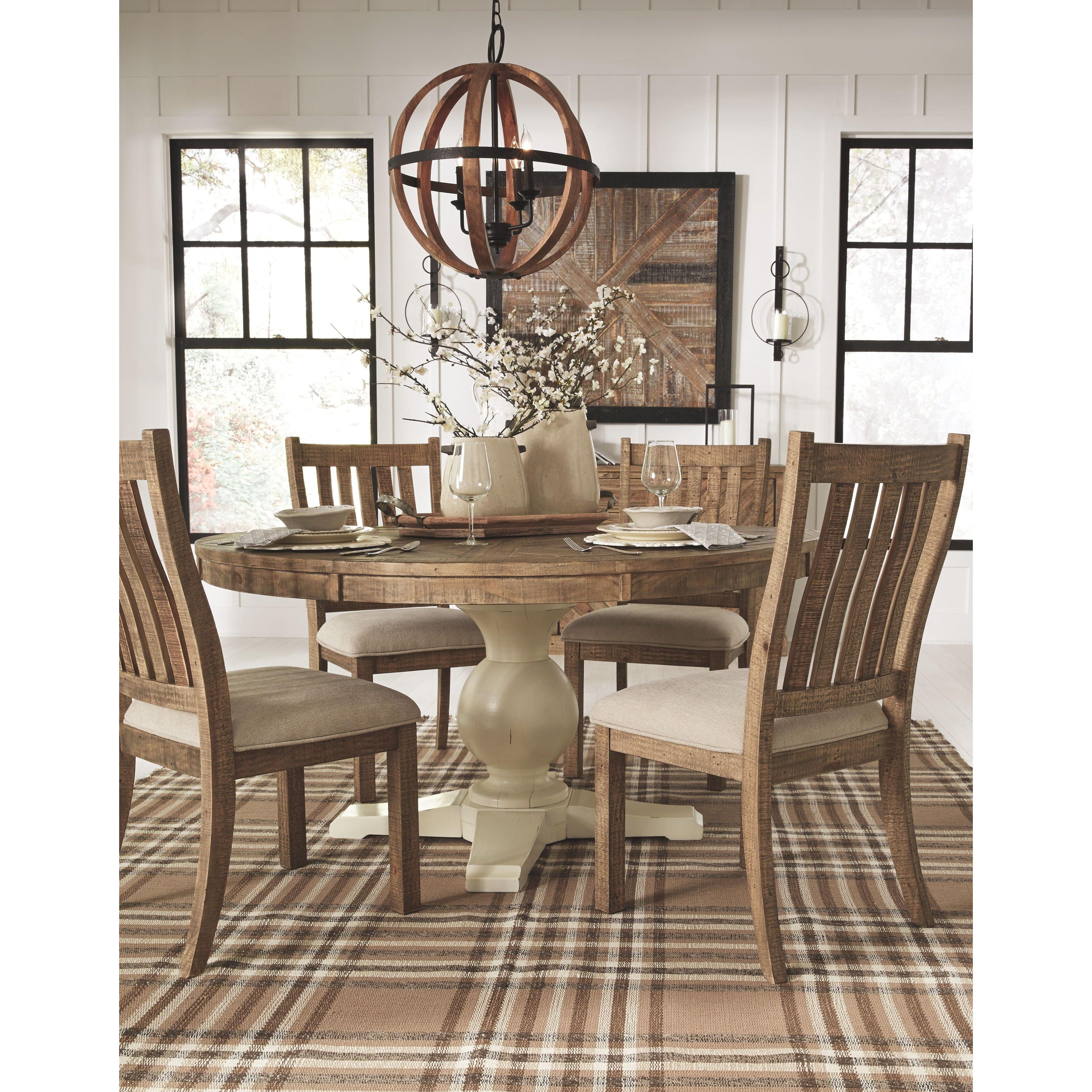 Made with Pine solids in a two-toned finish application. D754-50B table base and D754-01 chair have a textured white rub through finish. D754-125,-50T tables and -80 buffet are made with reclaimed pine solids in an trendy light grayish brown finish. D754-125 trestle dining table has a cross buck pedestal base and interesting inlay top with planked effect. Server has a chevron layup to coordinate with drawer and door storage. D754-01 chair has a broad rung ladder back design with light gray fabric cover or a stylish slip cover look with a linen like fabric. D754-01 side chair uses "Nuvella" performance fabric. D754-05 chair has a slat back design in an all-over light natural finish and seat cushion upholstered in a light tone performance fabric.