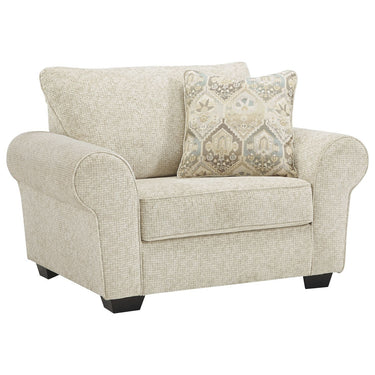 Blending classic elements like sumptuous flared roll arms with tailored box cushions and tapered black feet for up-to-date appeal, this oversized chair exudes that transitional aesthetic that looks and feels right at home. Offering plenty of room for everyone to make themselves comfortable, this large-scale chair is wrapped in a soft, chunky weave fabric loaded in texture. Light and lovely ivory upholstery makes for such an easy-breezy blend.