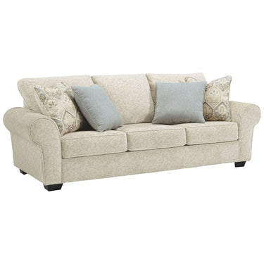 Blending classic elements like sumptuous flared roll arms with tailored box cushions and tapered black feet for up-to-date appeal, this sofa exudes that transitional aesthetic that looks and feels right at home. Offering plenty of room for everyone to make themselves comfortable, this large-scale sofa is wrapped in a soft, chunky weave fabric loaded in texture. Light and lovely ivory upholstery makes for such an easy-breezy blend.