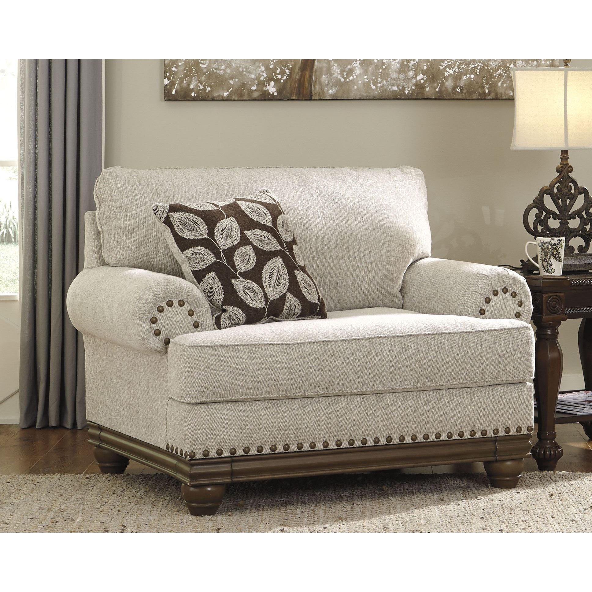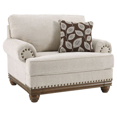 True classic character comes to life in this oversized chair with room for two to sit. Set back pleated rolled arms and warm brown exposed frame with bun feet are beautifully traditional. Lovely detailing carries itself through the herringbone weave in the soft upholstery. Seat cushion reverses to maintain durable comfort. Vintage-inspired jumbo nailhead trim graces the design. Botanical pillow in dark brown is a timeless touch.