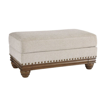 True classic character comes to life in this ottoman. Warm brown exposed frame with bun feet is beautifully traditional. Lovely detailing carries itself through the herringbone weave in the soft upholstery. Neutral tone lets you accessorize with any color. Vintage-inspired jumbo nailhead trim graces the design all around.