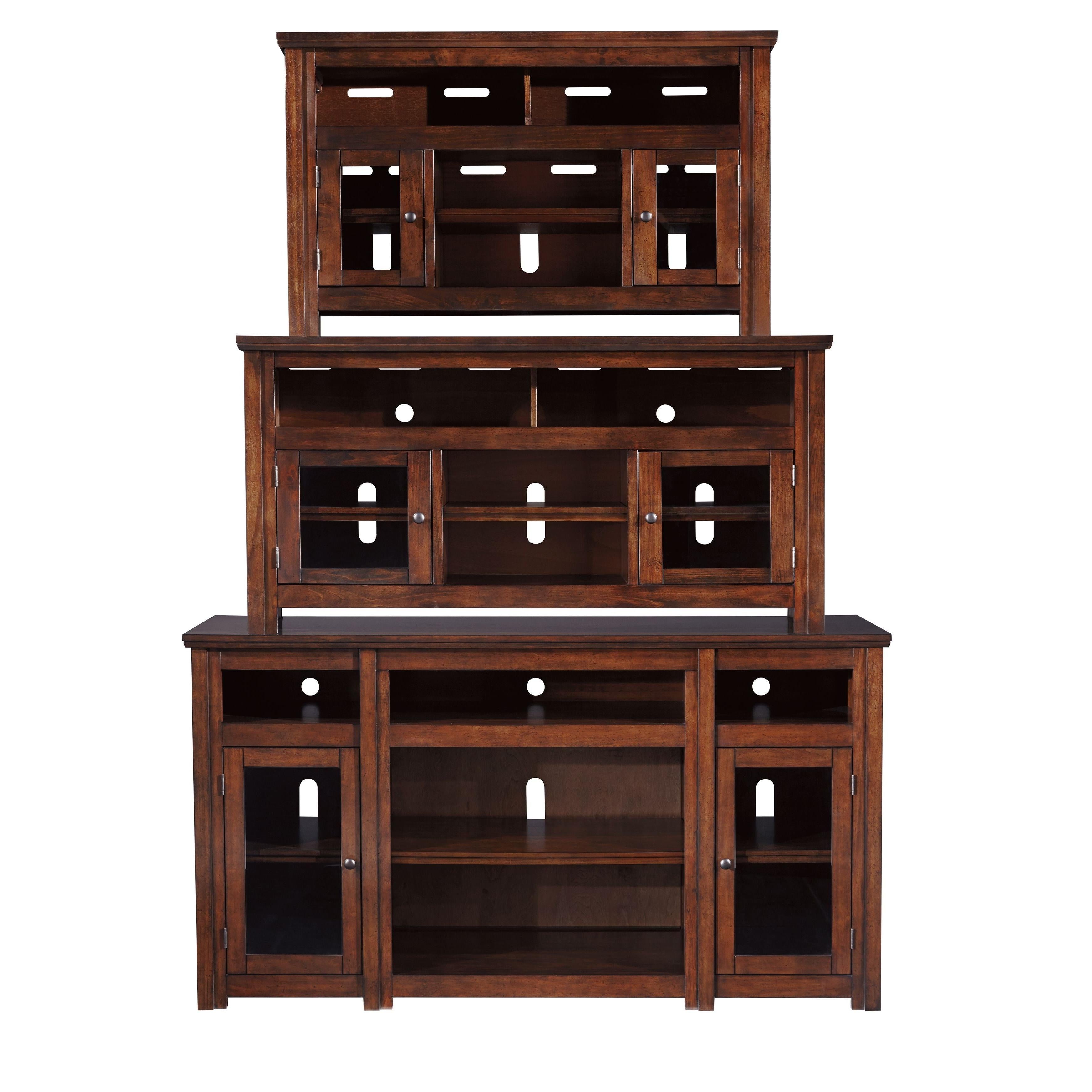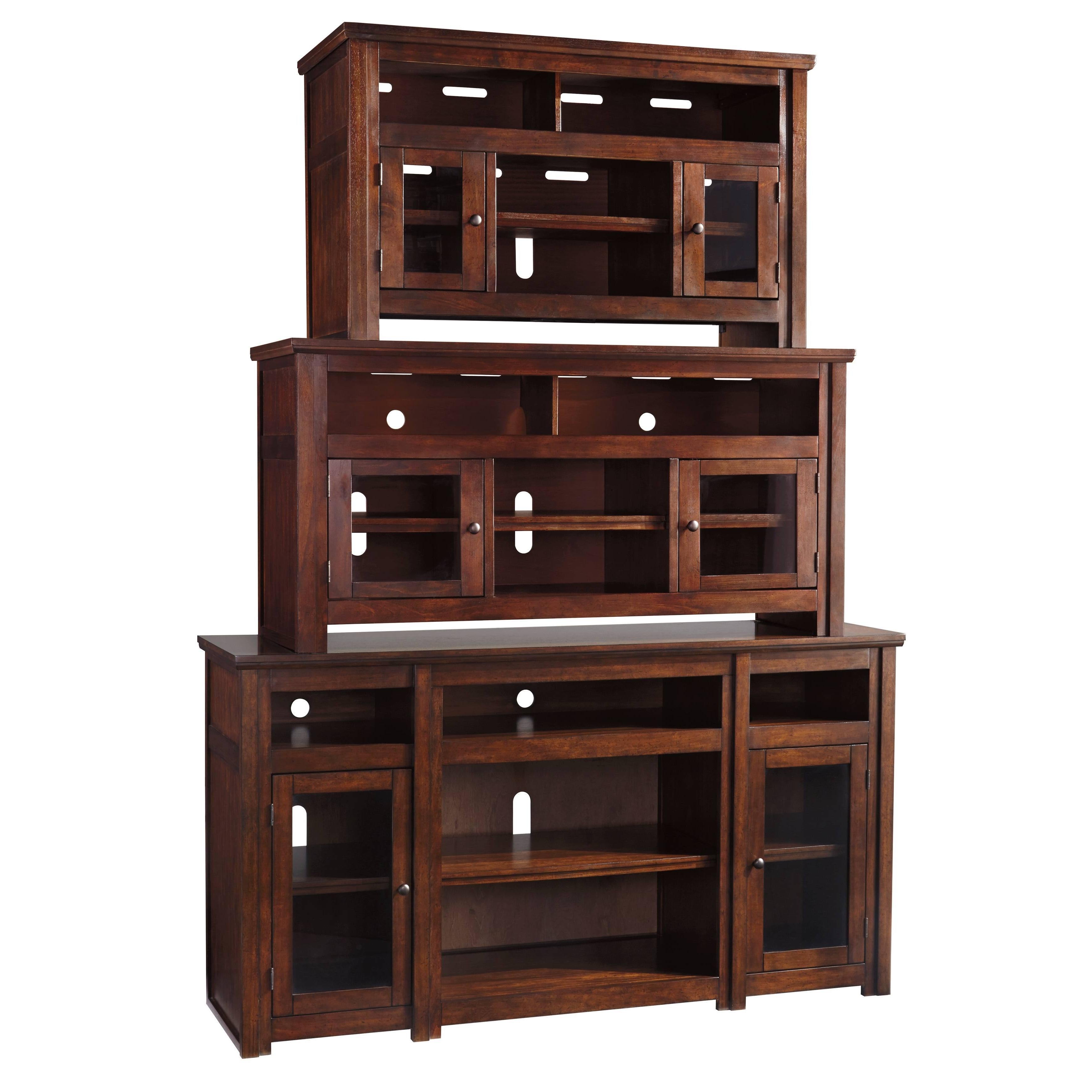 Need a stylish home for your television? This classic TV stand is masterfully crafted with entertainment needs in mind. You'll be fascinated with the robust feel and functionality of this remarkable stand. The recessed top center shelf accommodates a sound bar or other technology, while the lower adjustable center shelf is ideal for media storage. Two side cabinets with handsome glass doors allow more space to neatly keep things.