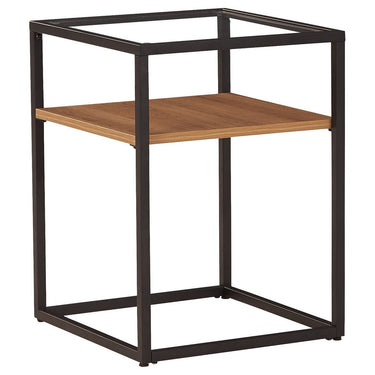 Complete any contemporary room with this accent table. A black finished metal frame creates a strong profile, while the glass top and light brown wood grain effect laminate shelf make a dynamic decorative piece with function.