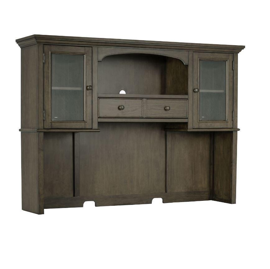 This burnished oak credenza with hutch is bound to enhance your office space. stately and traditional in style, there is plenty of storage space with five drawers, two top cabinets, and two lower cabinets that lock for safekeeping. crown molding detailing and paneling make for a magnificent display. supportive bracket style feet provide stability and an attractive upgrade for this wood credenza. include this piece in your traditional style office space.