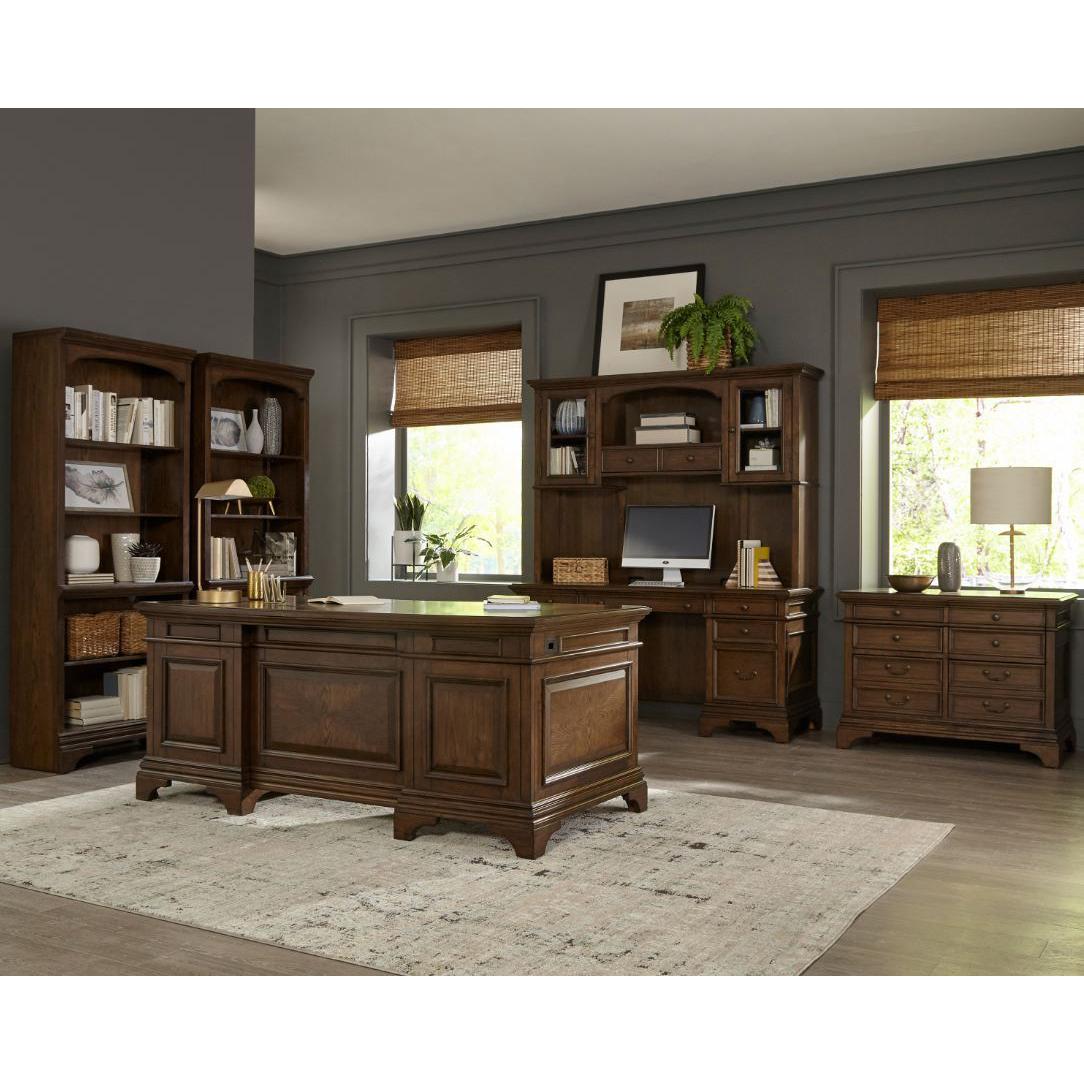 Feel like a ceo every day you sit down on this exquisite executive desk. finished in burnished oak, it provides a traditional stylish flair to your office space. two felt-lined top drawers allow you to store small items while you lock valuables inside the two built-in filing cabinets. removable dividers help keep your area extra organized. with beautiful wood paneling on the frame, this wood executive desk will help your workday breeze by with its spectacular style and function.