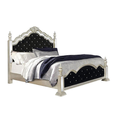 Invite a glamorous atmosphere into the master bedroom with this luxe bed from the heidi collection. a metallic platinum finish highlights the hollywood glam feel, accented by mirrored panels framing the headboard and footboard. the exquisite bombe style headboard and footboard feature intricately carved wood details along the edge, with turned finials for added visual interest. plushily upholstered headboard and footboard showcase a rich black velvet with tufting detail. this luxe bombe bed makes the perfect centerpiece for a queenly bedroom.