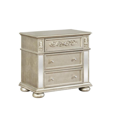 Keep necessities close at hand with this three drawer nightstand from the heidi collection. the metallic platinum finish gives a glamorous look with mirrored accents. three drawers offer ample space to organize those needed items. ornate wood carved design offers additional intricate detail in this luxe nightstand. pair two on either side of the bed for a symmetrical decor theme, or use as an accent table anywhere to offer additional storage space with a glam look.