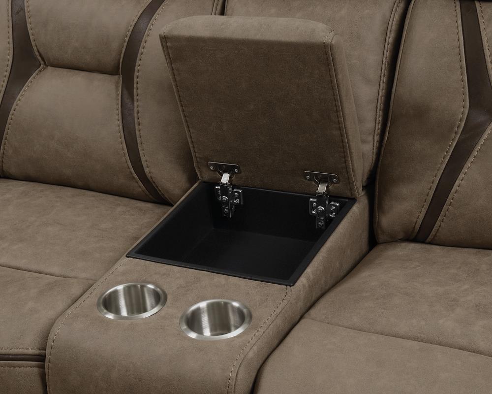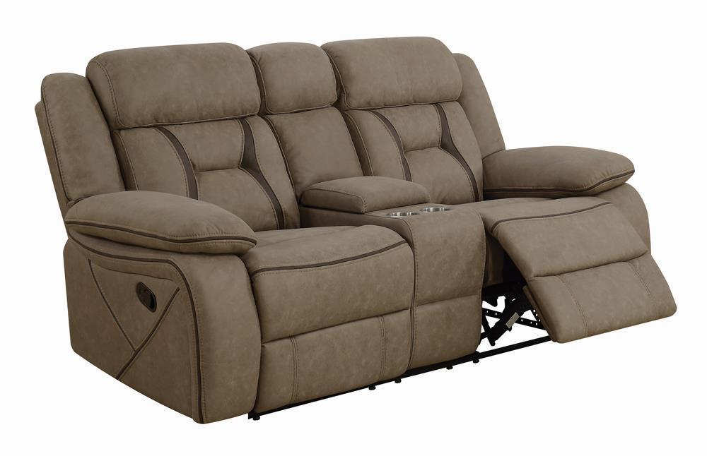 From lazy days to movie nights, this motion loveseat will have you lounging in luxury. with its exquisite level of comfort, you'll enjoy countless hours of relaxation. its seats are covered in thick, plush padding and sumptuous fabric upholstery. it comes complete with a center console for the added bonus of versatile storage. cozy and convenient, this loveseat is an inviting addition to any living room.