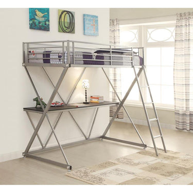 Cool, convenient, and contemporary, this loft bed has it all. with two furnishings in one, it's the ultimate space saver for smaller sized rooms. a twin bed up top offers soft, relaxing comfort, while a built-in desk down below provides a sturdy surface for working and studying. its striking design is crafted with sleek, metal lines for a cool, updated aesthetic. a pleasing silver finish adds a modern edge to its bold silhouette.