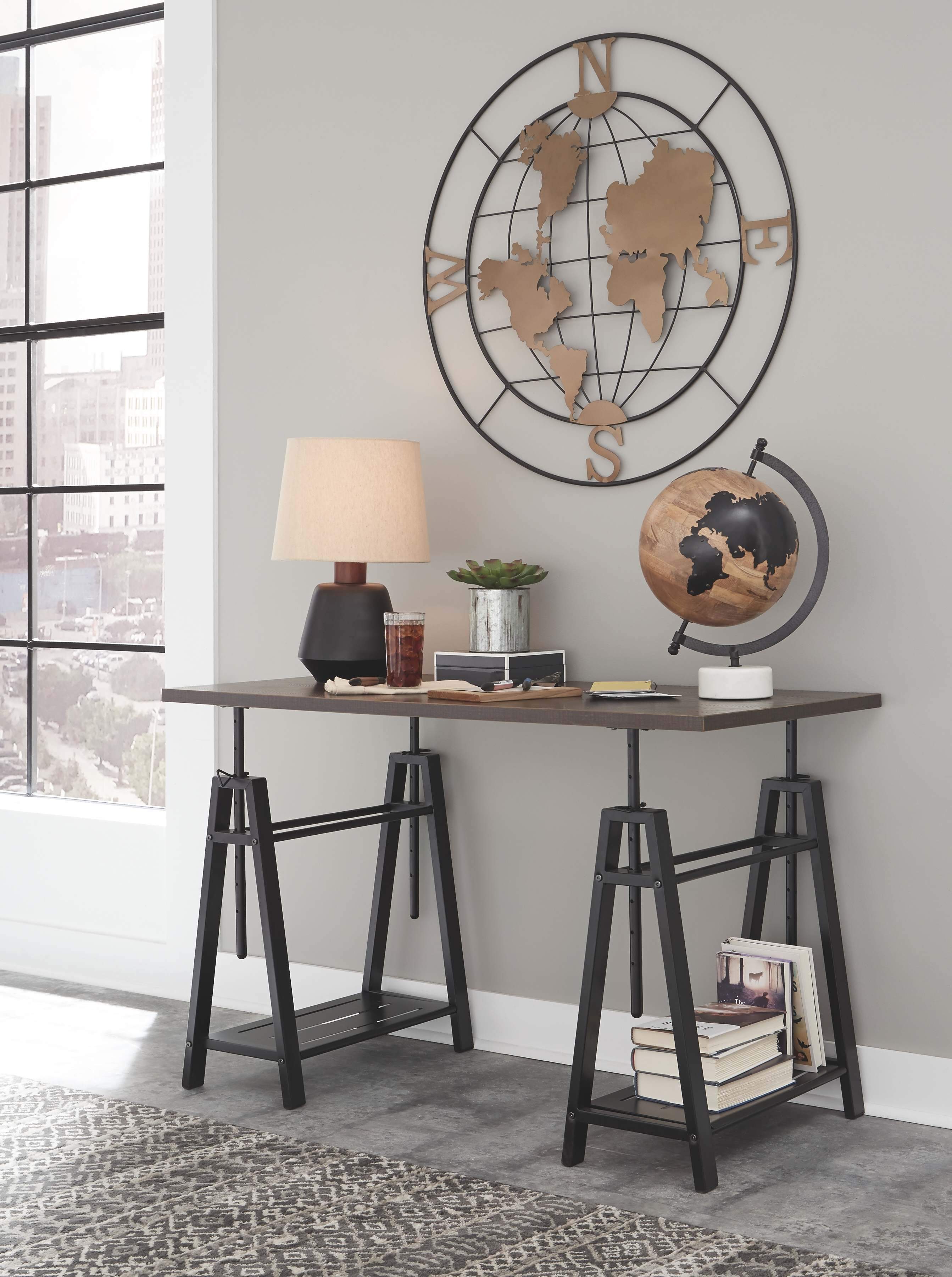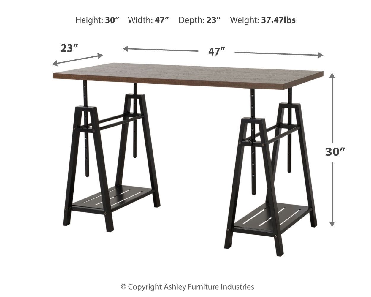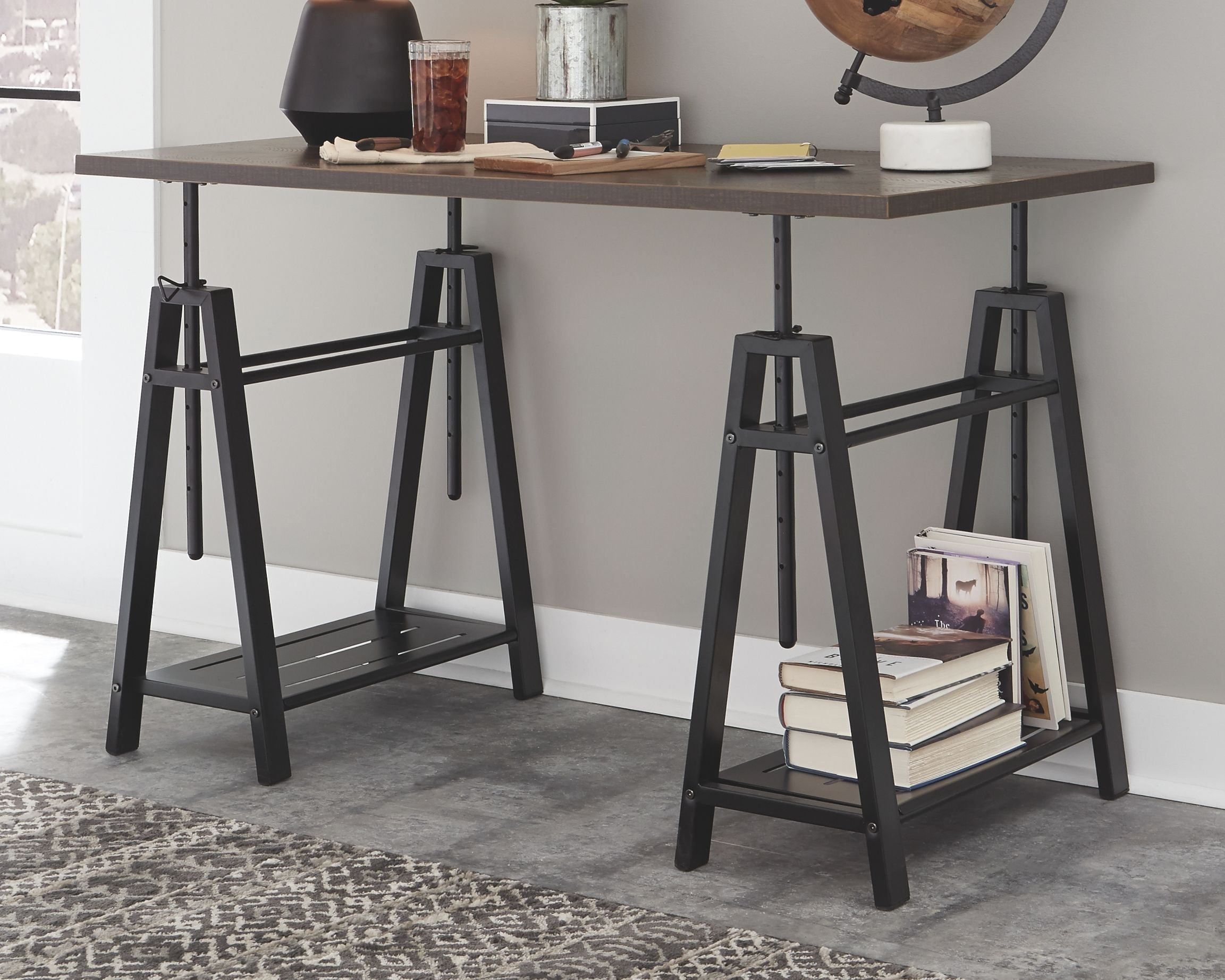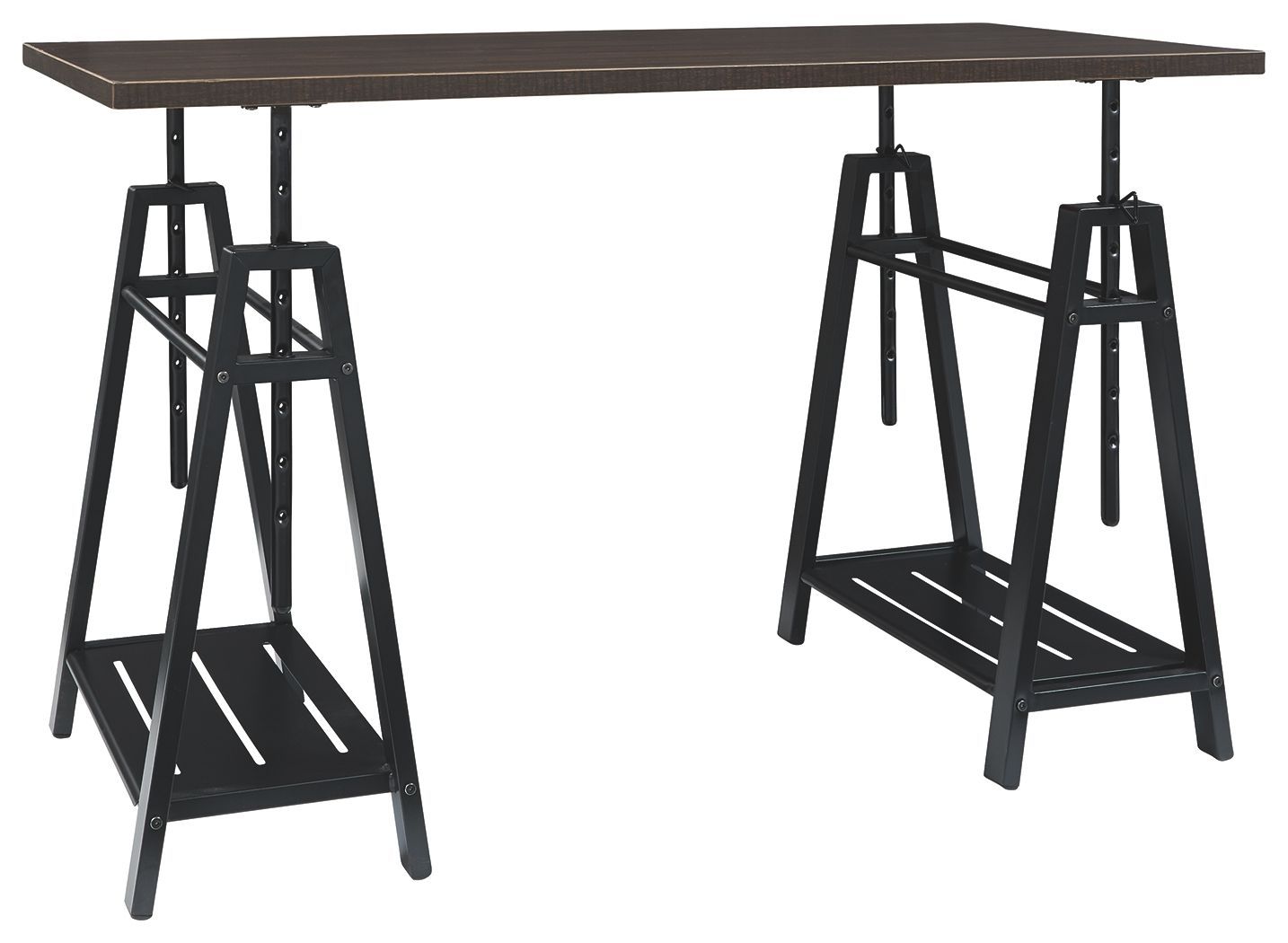 Elevate your style and your productivity with this adjustable height desk. An especially cool look for those short on space, this minimalist-chic desk with open storage shelves and sawhorse legs offers eight height adjustment settings to give you plenty of options when working on homework, art projects or just relaxing. This desk's two-tone combination of warm brown wood tones and tubular black metal is contemporary style at its best.
