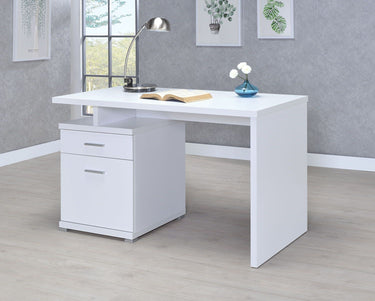 A fresh, energetic ambiance creates design versatility in a compact space. ideal for a small office or a child's room, this office desk is built to impress. with a bright white finish, it delivers an enticing and invigorating flavor. enjoy the flexibility of a reversible setup that positions its drawer and file cabinet unit on the left or right side. this modular-style office desk provides a spacious writing surface, a storage drawer, and a file cabinet that accommodates both legal and letter size documents.