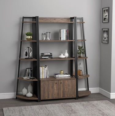 Rustic with an industrial flair, this three-piece bookcase set features an aged walnut wood finish with a contrasting wood grain.each piece is supported by a sleek, thin metal frame, which offers a matte black finish.the center bookcase also offers a lower two-door cabinet space and three tiered shelves that align with the corner bookcases.each corner bookcase offers five-shelves for displaying novels and favorite authors.place this bookcase in a living room for a striking, elegant look.