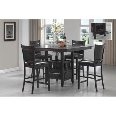 Gather your loved ones around this sleek, chic table for a remarkable dining experience. its simple silhouette is enhanced by an eye-catching, slatted wood design. a center cabinet with a built-in wine glass holder offers ample storage space. with a classic finish of rich cappuccino, its gorgeous design is pulled together with a striking element of glamour and class. this exquisite, counter-height table is perfectly sized to accommodate an elaborate meal without taking up too much space.
