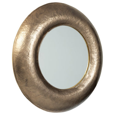 Brighten any space in modern style with this wall mirror. Surrounded by a thick convex round frame crafted of sturdy metal with hammered texture and brilliant antiqued goldtone finish makes this wall mirror a trendy, contemporary must-have for your home.