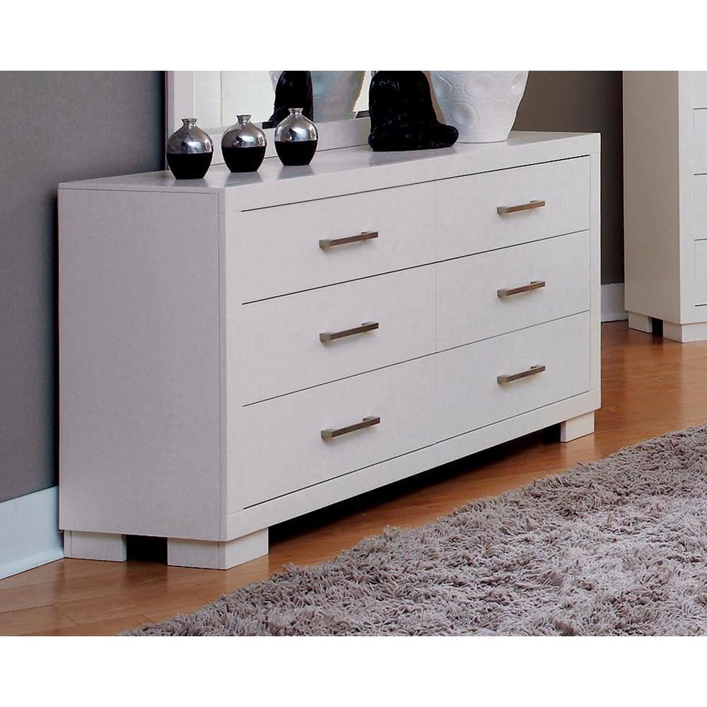 With clean lines and a modern design, this contemporary dresser invites elegant functionality into a master en suite. with six spacious drawers, it provides plenty of space for convenient storage and organization. its upper drawers are lined with soft felt, protecting your most delicate pieces. a simple, white finish and smooth, silver handles add subtle glamour to its sleek silhouette. constructed from solid wood, this dresser is a durable delight that is sure to enhance any bedroom.