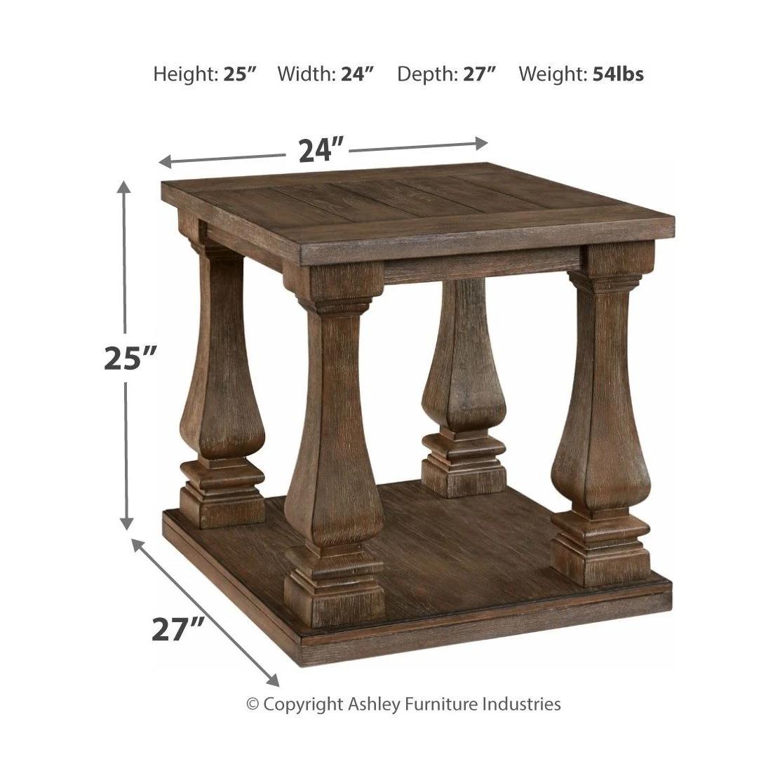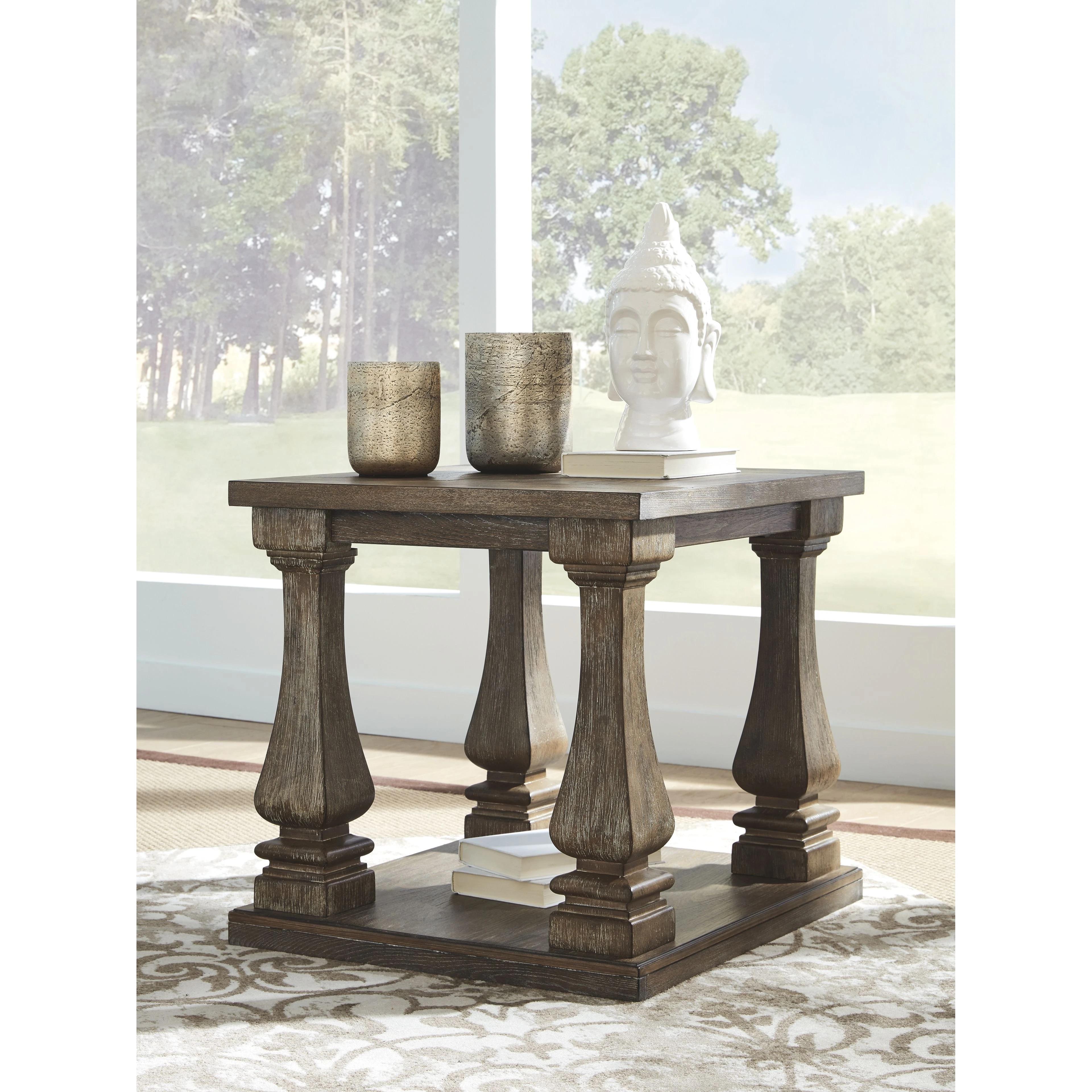 Homey. Hearty. Heavenly hued. Luring with a distressed weathered gray finish and square baluster legs set on a broad lower shelf for great presence, the Johnelle end table is sure to make your homestead feel that much more like home. The look is beautified with elm veneers and a framed and plank-effect tabletop for a richly crafted masterpiece made for years of satisfaction.