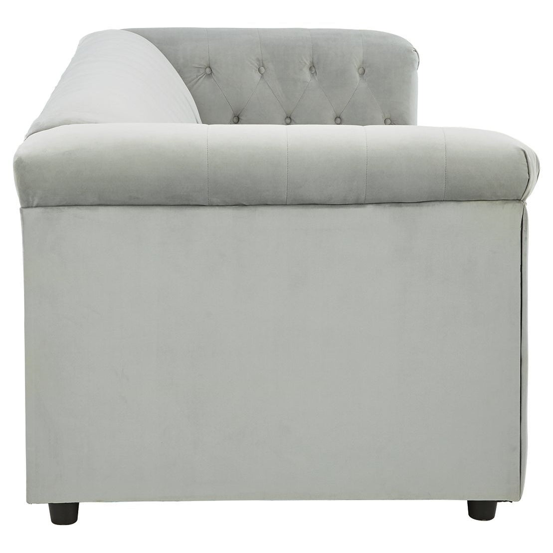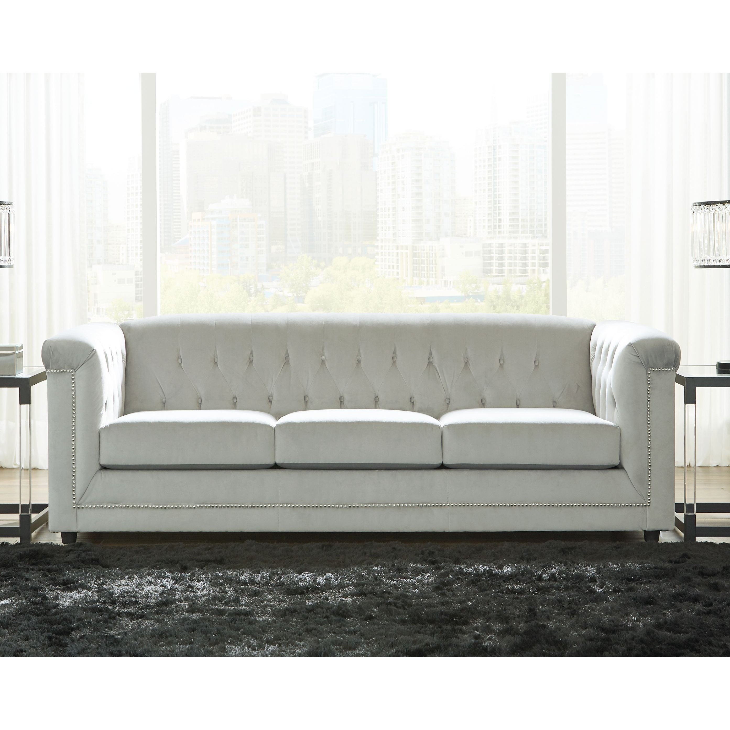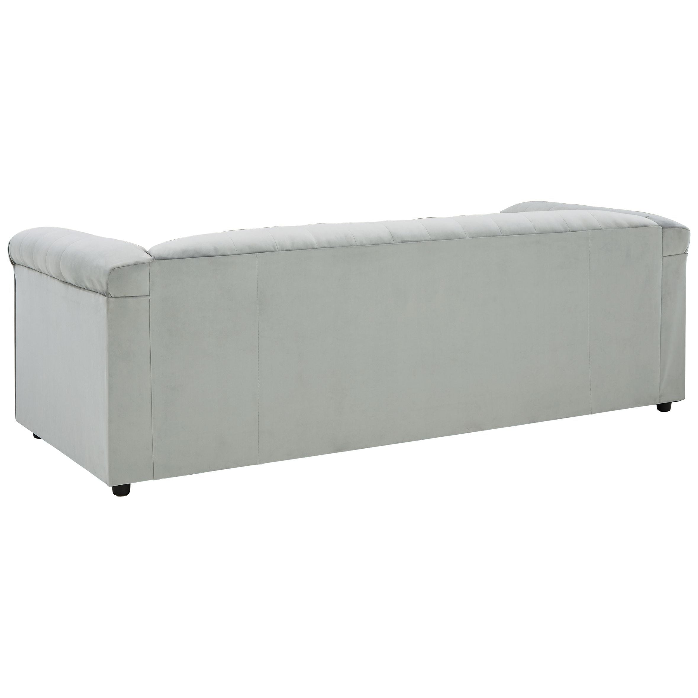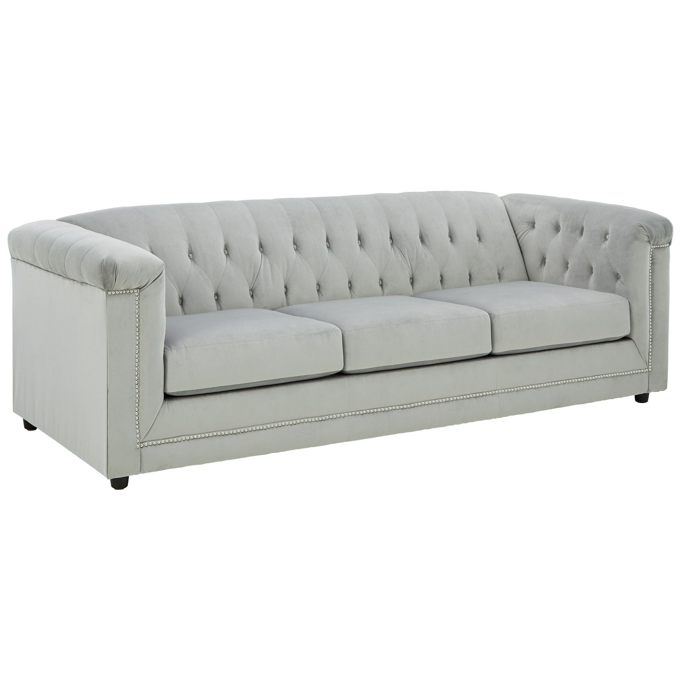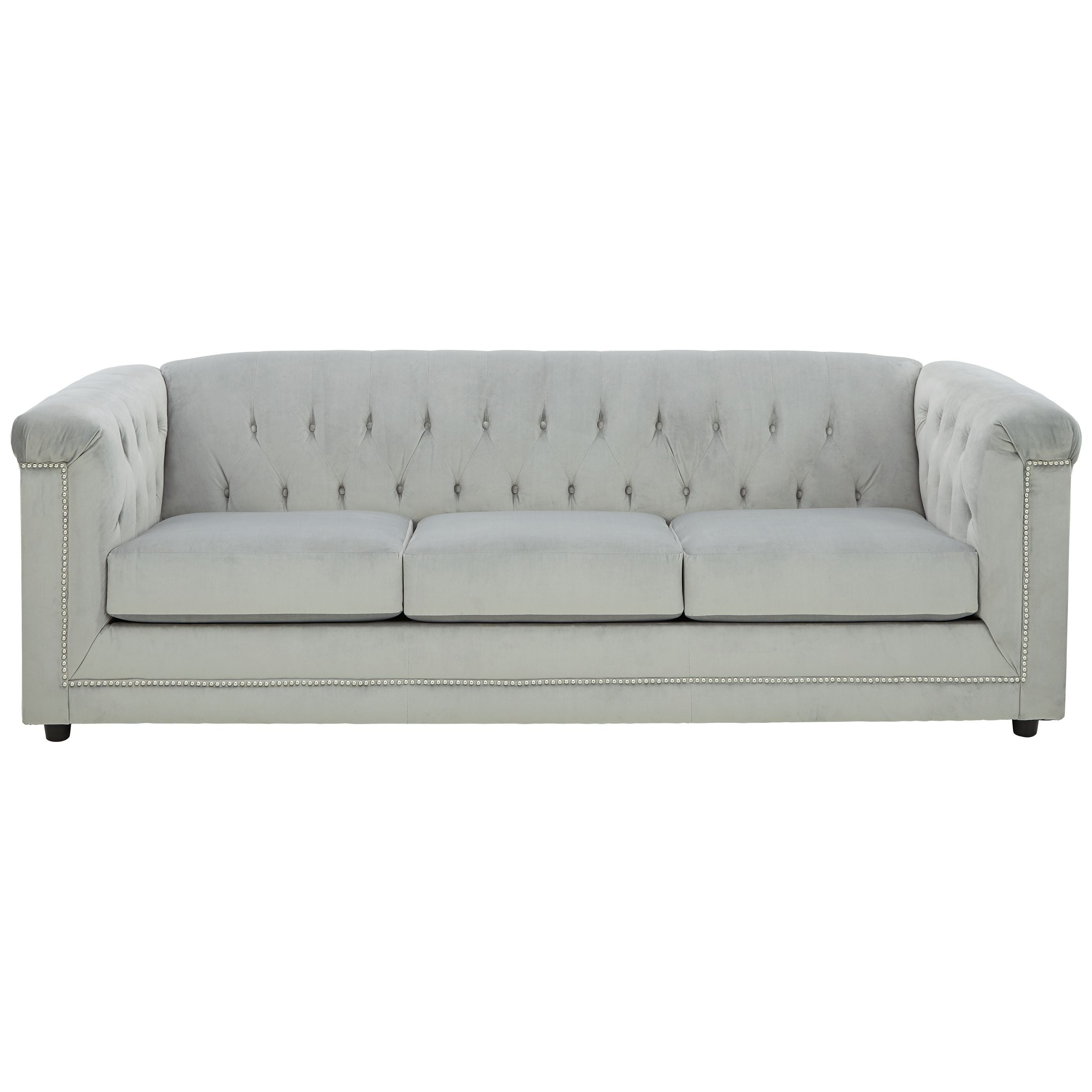 With a timeless classic Chesterfield styling that's very much in vogue, this sofa makes a brilliant statement. Its beautifully neutral silvery gray velvet fabric looks as good as it feels. Nailhead trim, button tufting and high shelter arms give the sofa an effortlessly elegant appeal. The hidden leg design is an on-trend addition for modern spaces.