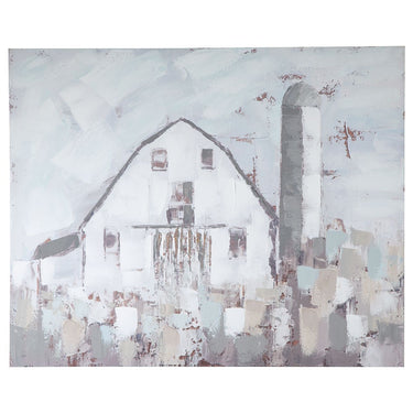 Make your modern farmhouse or cozy cottage complete with this brilliant rendition of barn wall art. Muted palette blends shades of blue, gray and white for a fabulously faded aesthetic. Gallery wrapped canvas is right on trend.