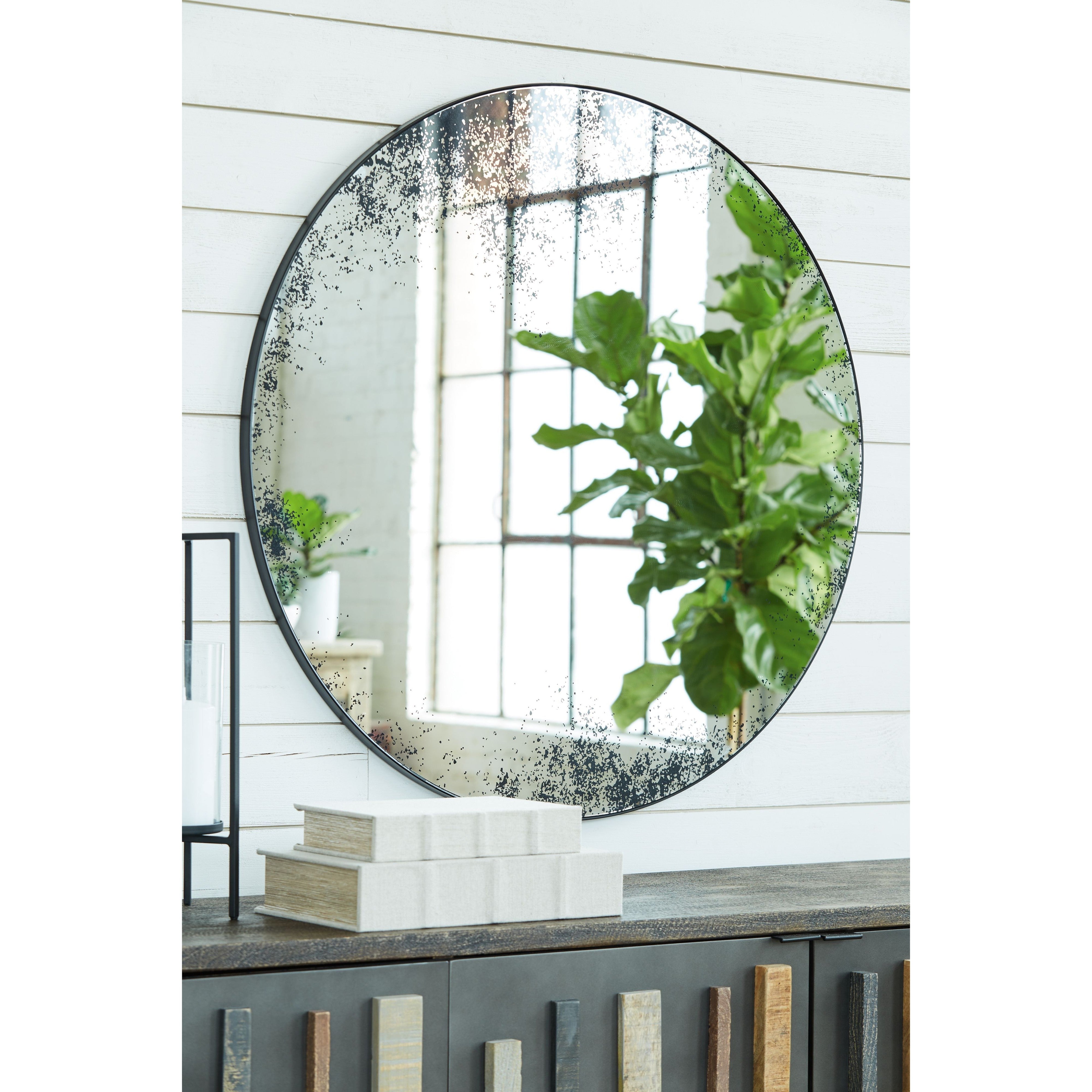 If an ultra-modern look is the direction you're going for, this accent mirror is beautifully on point. Distressed glass in antiqued black gives contemporary style a striking twist. A solid black frame rounds out the design with a sense of subtle sophistication.