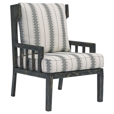 Add some global-chic style to your domicile with this designer accent chair. Looking so much better for the wear, the sturdy wood frame charms in a distressed black finish. Covered in an ivory and black tribal pattern, reversible cushions enhance the casual coolness.