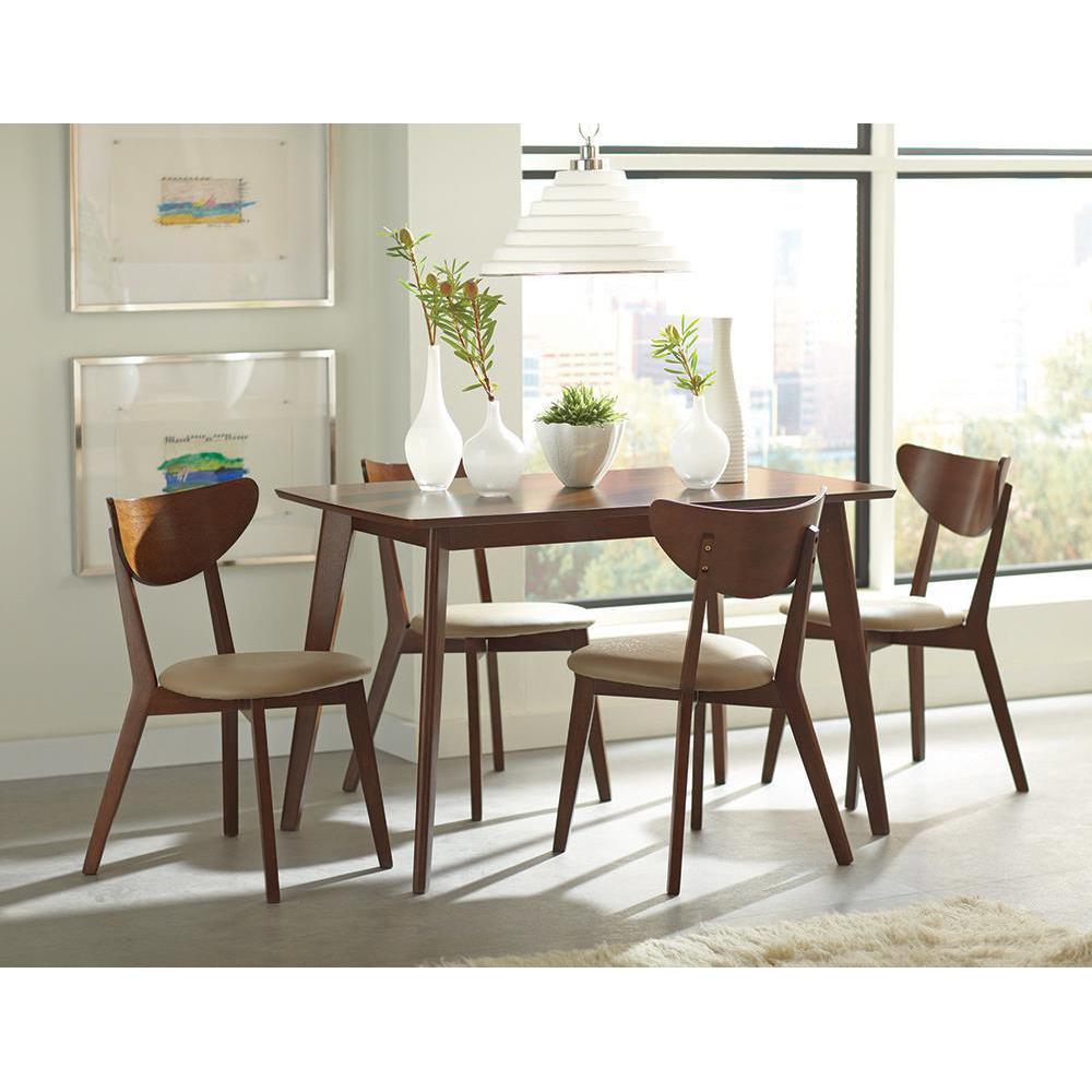Anchoring the kersey collection, this solid wood dining table imparts a retro feel. rectangular top and angled legs give it a resolute profile. finished in chestnut that goes well by a sunlit window overlooking a garden. crafted for functionality yet appreciated for its adaptability to your one-of-a-kind home decor. choice of two chair styles to customize the look.