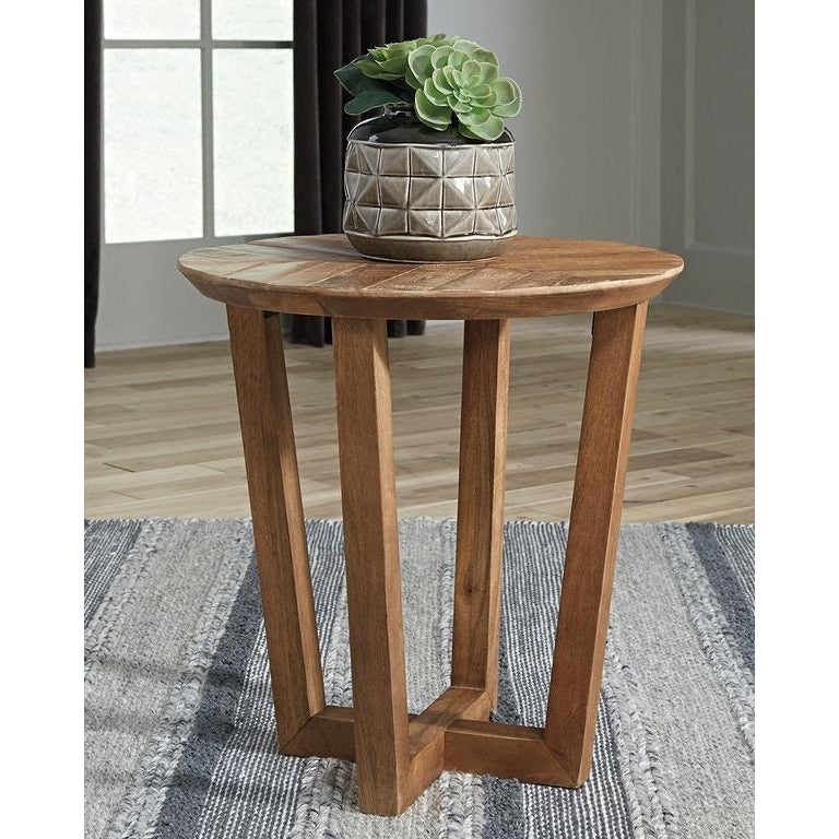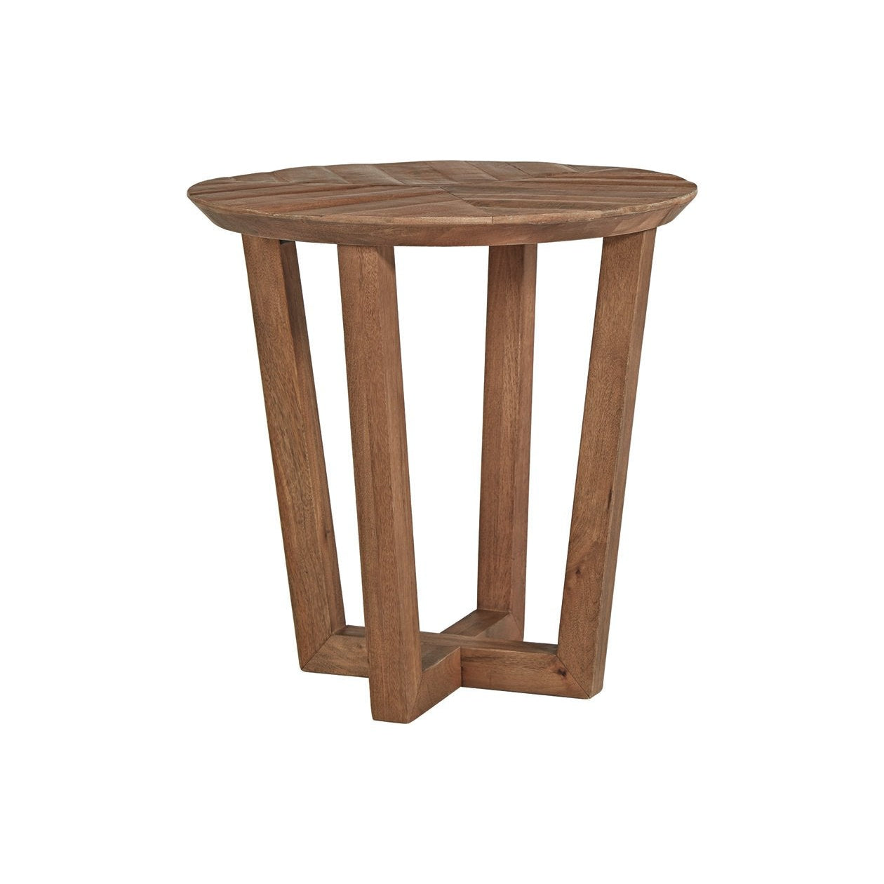 Round out your seating area with the Kinnshee end table in a contemporary round design. Angled legs are simple, yet striking—while its planked mango wood top is anything but ordinary. A rich, waxy finish enhances the wood's tonal variation for a look sure to entice.