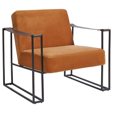 Less is so much more with this ultra-cool accent chair. A mastery in open-concept living, this chair with sturdy metal base is enriched with thickly cushioned velvet upholstered seats. Brown leather armrests are a strapping touch.