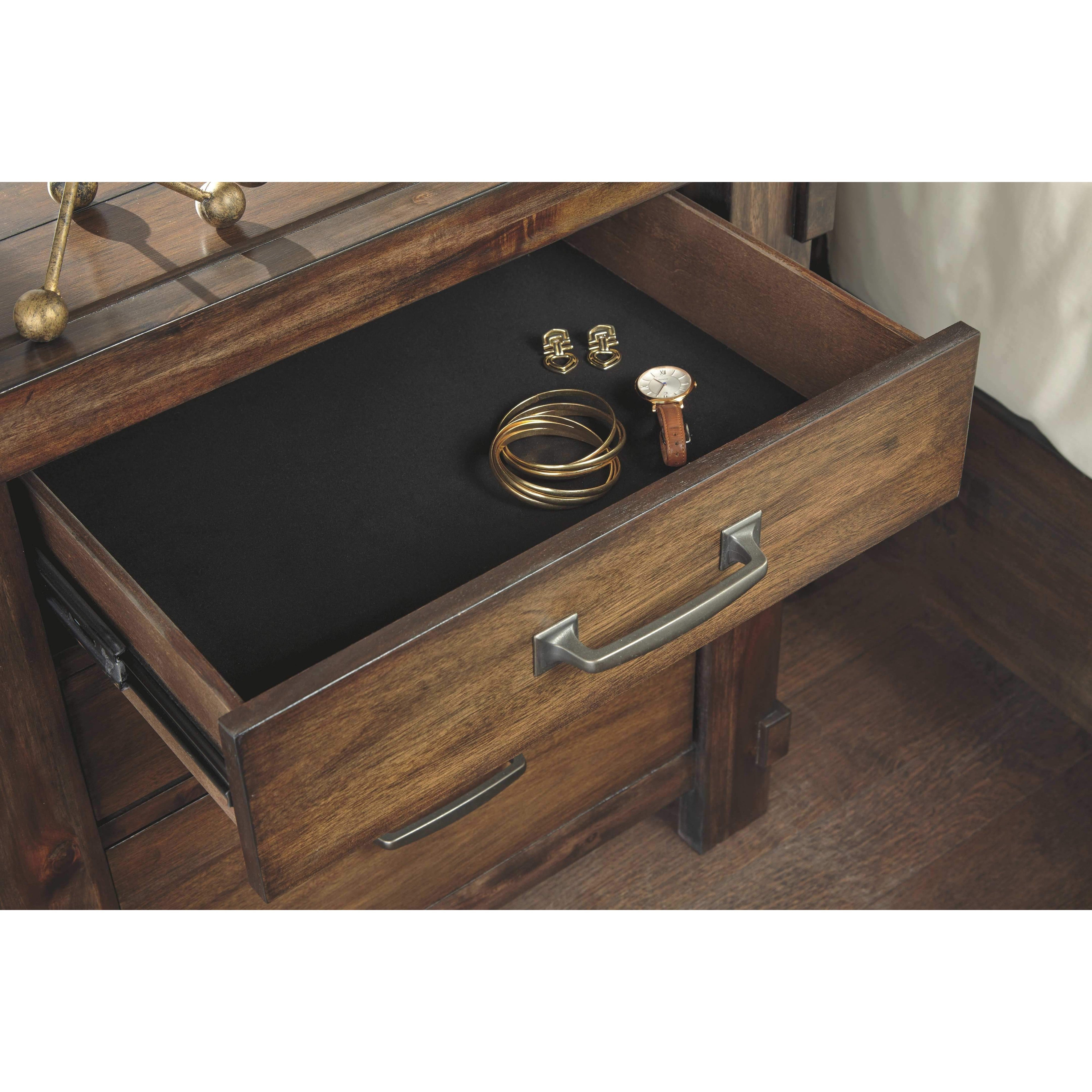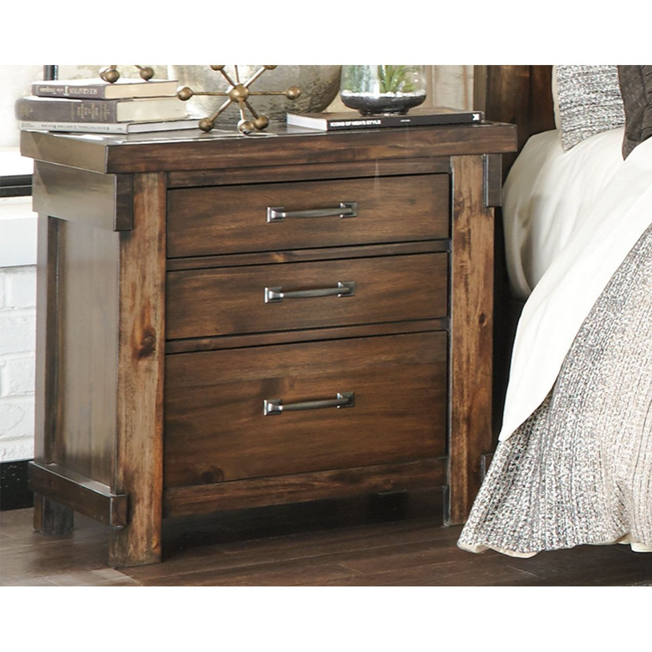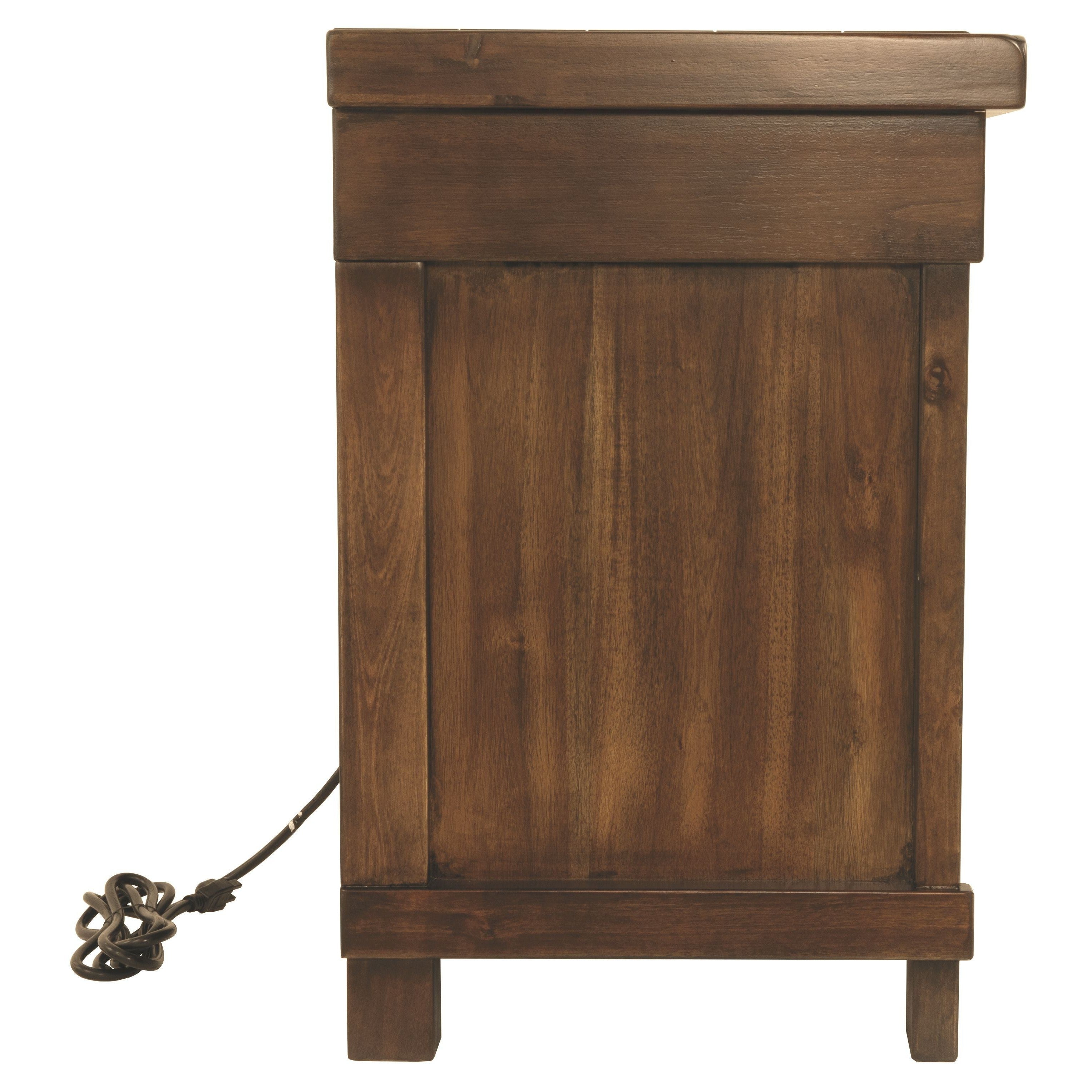 Opposites attract. This nightstand opens our eyes to how casually rustic styling and an industrial hip vibe make for one happy marriage. Elements that beautify the chunky, linear profile include through-tenon styling, replicated planking and a high-grain finish rich with tonal variation. A subtly placed power/USB charging port is a nice surprise. What's even more unexpected: how such a high-quality designer piece can be so attractively priced.