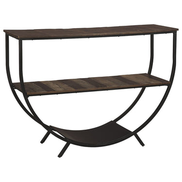 No ordinary take on modern farmhouse styling, this console sofa table serves up shapely style. Brown, gray and white hues give the distressed top and shelf loads of cool character. Curvaceous black metal base brings a fresh twist into the mix.