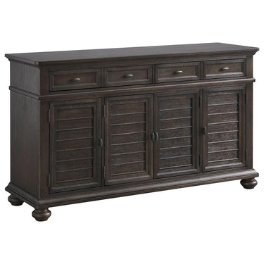 The perfect complement to any dining room or living room, this dining server is fashionably functional. Designed with multi-use practicality in mind, it serves equally well as a living room console. Along with three spacious cabinets and hidden shelf space, two top drawers with full extension glides take storage to the max. Cheers to the wine rack, as well.