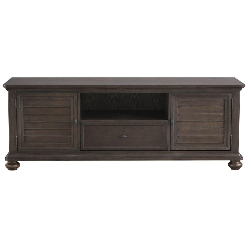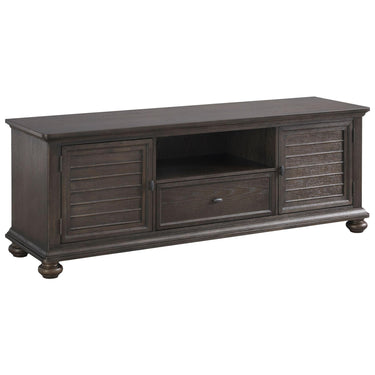 The perfect complement to any living room or family room, this TV stand is fashionably functional. With two spacious cabinets, open storage and a drawer with full extension glides, this TV stand takes storage to the max. And with cutouts for wire management, it's right in tune with your needs.