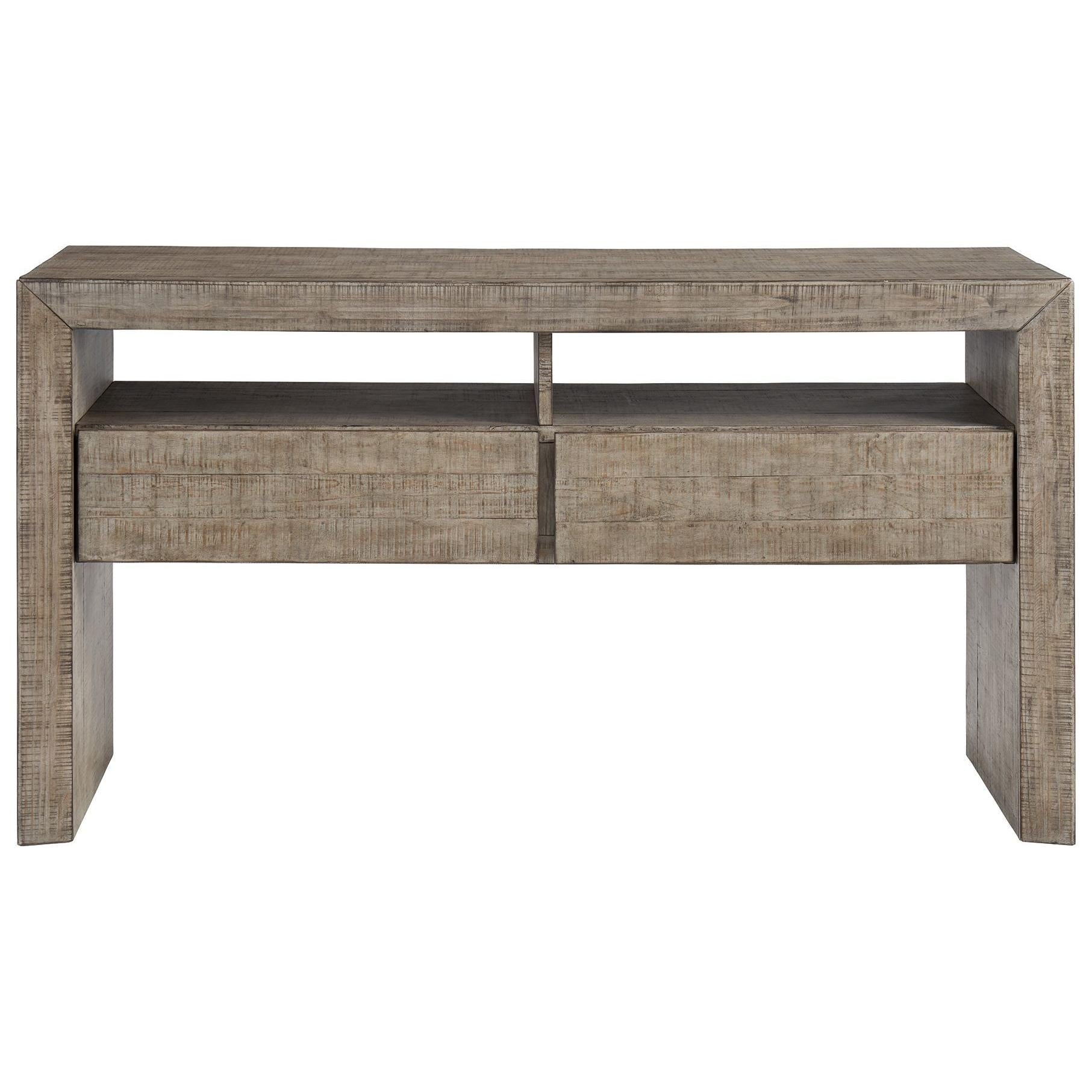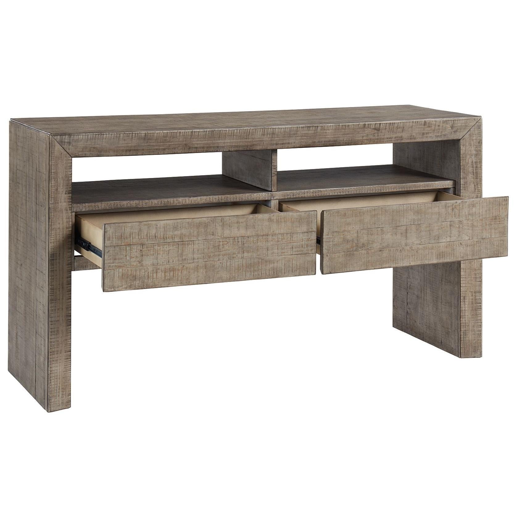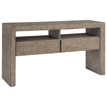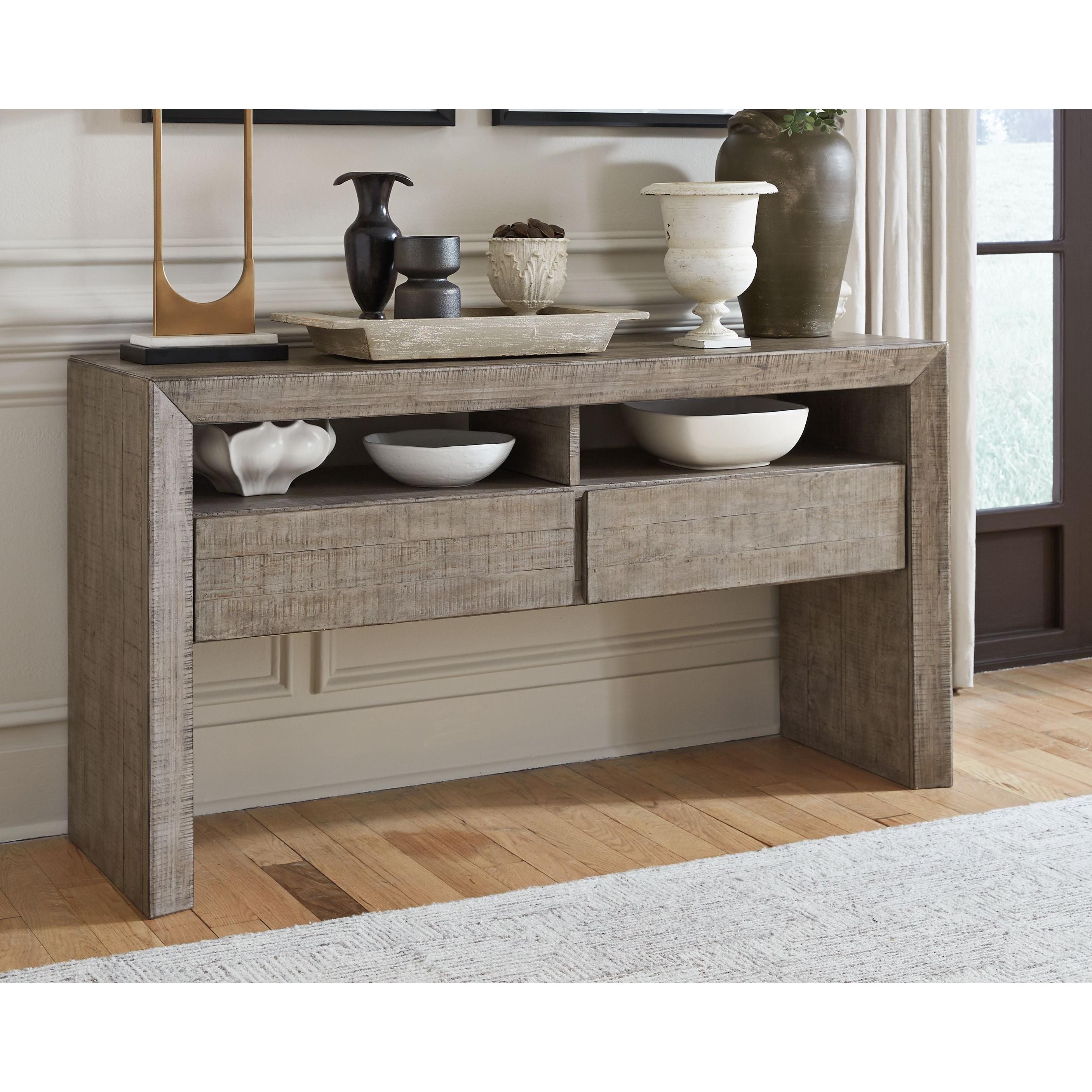 Balancing chic flair with a relaxed sensibility, this dining room server strikes just the right tone for rustic sophistication. Beautifully clean lines are subtly enhanced with a complex weathered gray finish and rough-sawn texture. Adding another layer of dimension, open shelving and hardware-less drawers make this server the epitome of easy elegance.