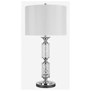 Invite charm and beauty to your home decor as you illuminate your space with this table lamp. Gleaming chrome-tone metal is accented with two stacked crystal bead and clear glass tubes, and a crisp white drum shade completes the look. Place in your entryway or living room for a dramatic effect.