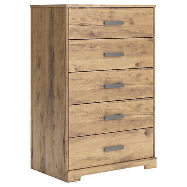 Simply stunning in its versatility, this chest of drawers takes a relaxed approach to rustic style. Its golden finish has a universal appeal that's oh-so inviting. Matte black hardware grounds the look with a hint of modern flair. Whether it's in a guest room or kids bedroom, this warm and welcoming piece complements a variety of settings.