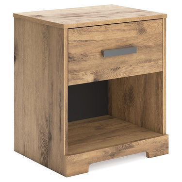 Simply stunning in its versatility, this nightstand takes a relaxed approach to rustic style. Its golden finish has a universal appeal that's oh-so inviting. Matte black hardware and an open cubby ground the look with a hint of modern flair and function. Whether it's in a guest room or kids bedroom, this warm and welcoming piece complements a variety of settings.