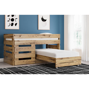 Golden rustic finish over replicated oak grain with authentic touch. Large matte black hardware. Spacious drawers with ball bearing glides offer a smooth opening and closing of the drawer. Vinyl wrapped drawer sides and back for extra durability. Panel headboards (255,256,257) feature decorative matte black sconce lights. Night stand (EB2712-291) accommodates to any 10.5"W x 10.5"D x 11"H storage bin. Twin Loft bed (68P,68R) and the twin loft caster bed (-68B) requires the B100-11 roll slats. Platform beds (EB2712-111,112,113) no additional foundation is needed. Assembly required. Safety is a top priority, clothing storage units are designed to meet the most current standard for stability, ASTM F 2057 (ASTM International). Drawers extend out to accommodate maximum access to drawer interior while maintaining safety. These items pair well with the EW2712 and EW2712.
