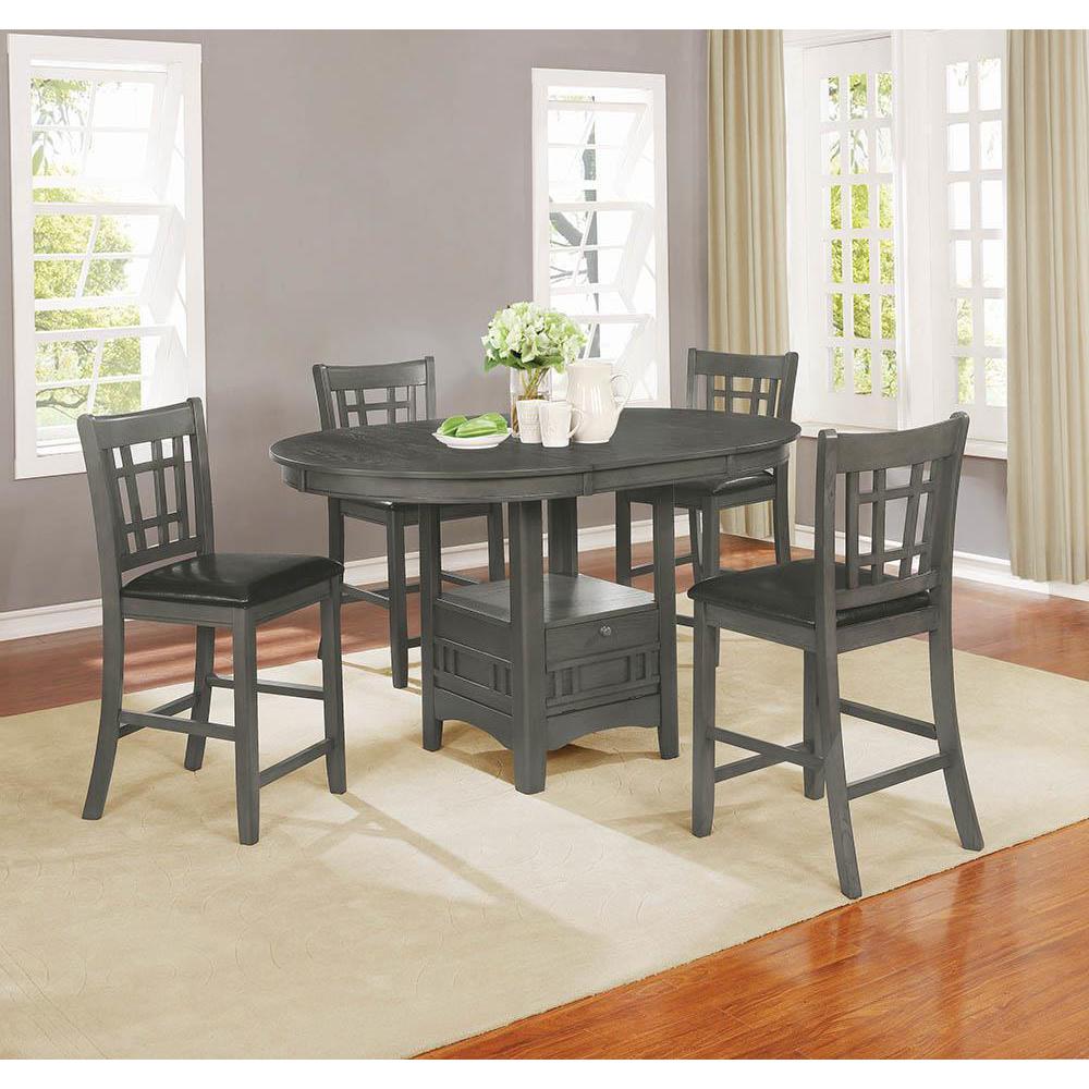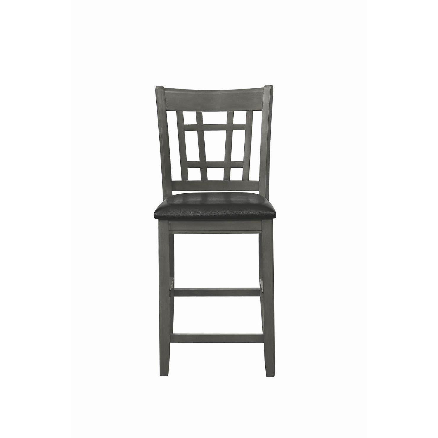 Embrace the versatility of transitional style and a chic finish. this counter height dining chair is a charming addition. a window pane-inspired seat back features vertical and horizontal slats that adds depth and detail to any decor. each chair is meticulously crafted from asian hardwoods and features a stylish medium grey finish. a beautiful addition to a dining room or breakfast nook, the chair offers a comfortable seat wrapped in back faux leather upholstery to accent a clean look and feel.