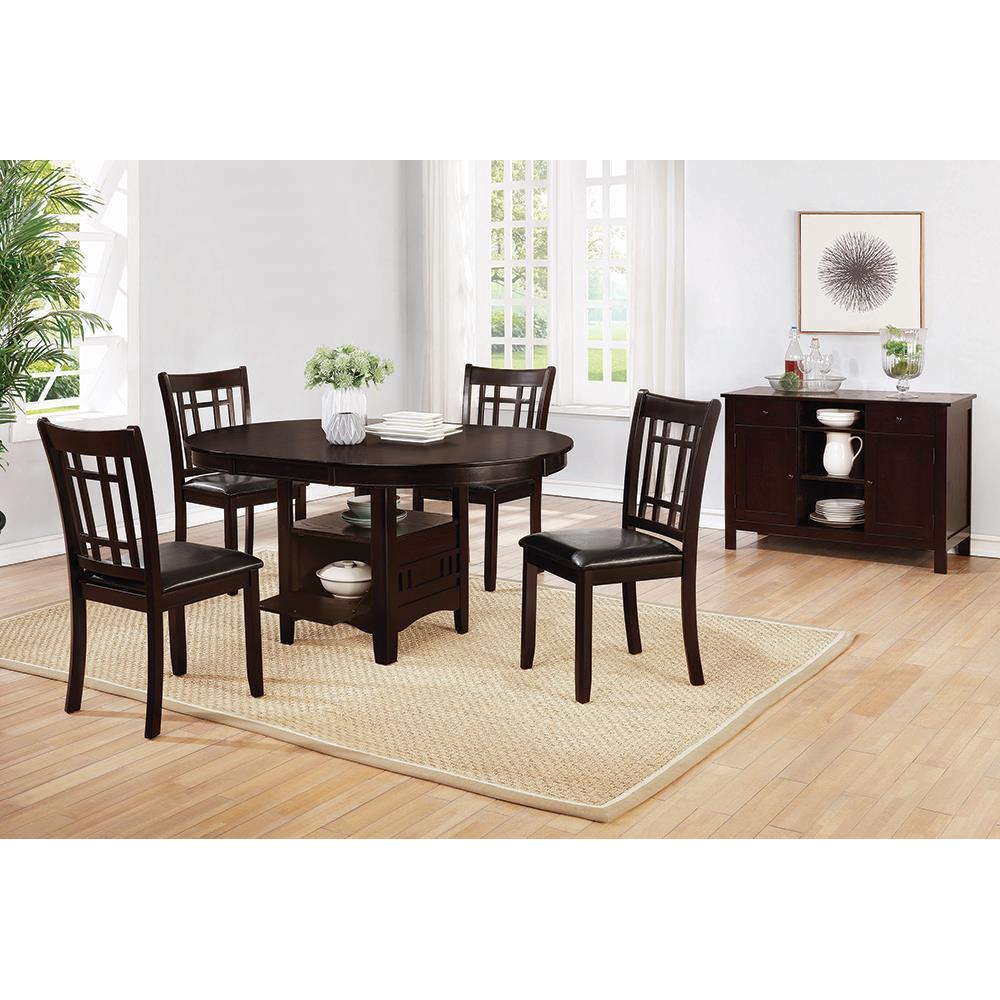 Sturdy, functional dining chair is part of the transitional lavon collection. back rest features wood styling in rectangular design. slightly flared back legs and back rest and with straight front legs enhance a silhouette that's half pragmatic, half eclectic. rich espresso finish and black leatherette seat are aesthetically pleasing. consummate complement to matching dining table.