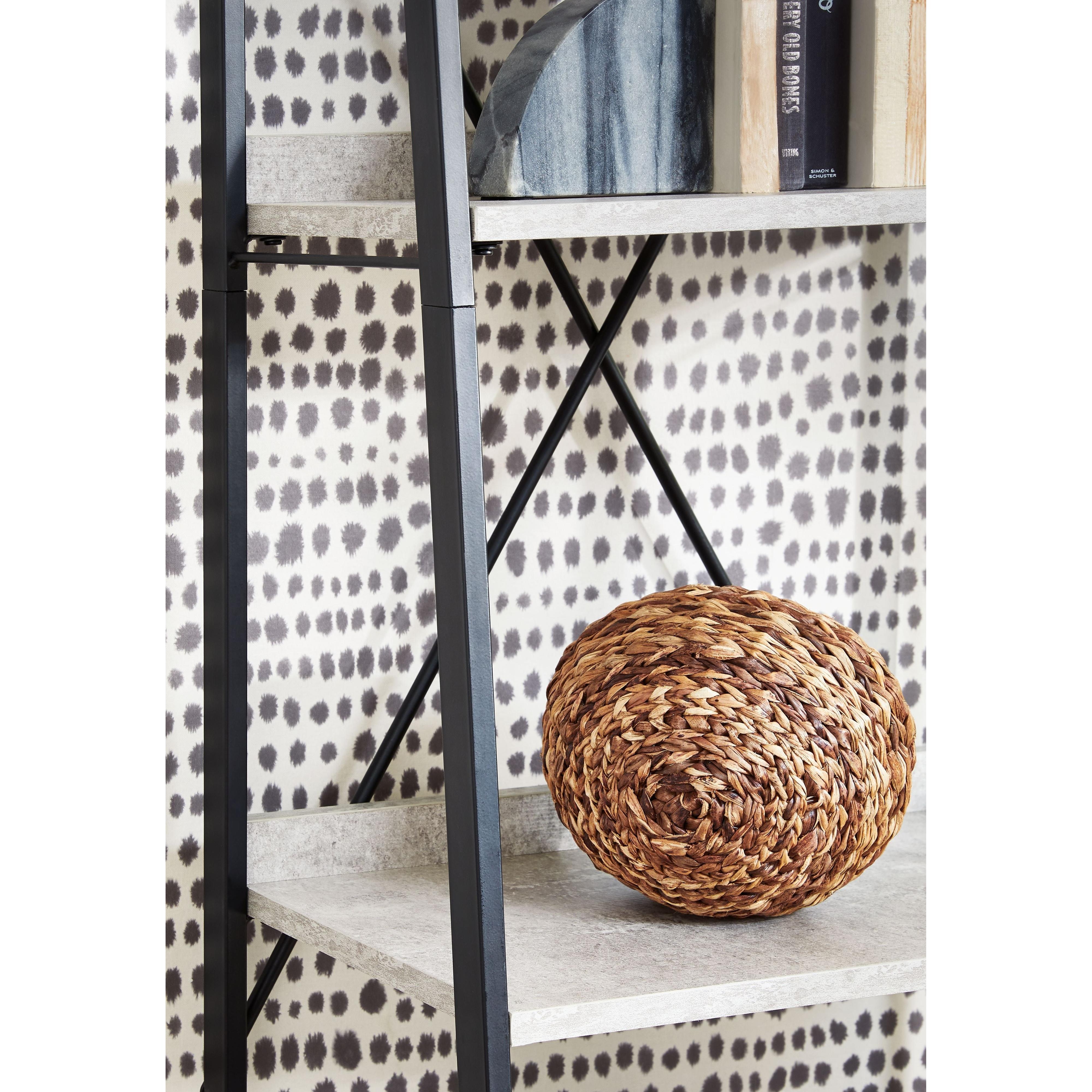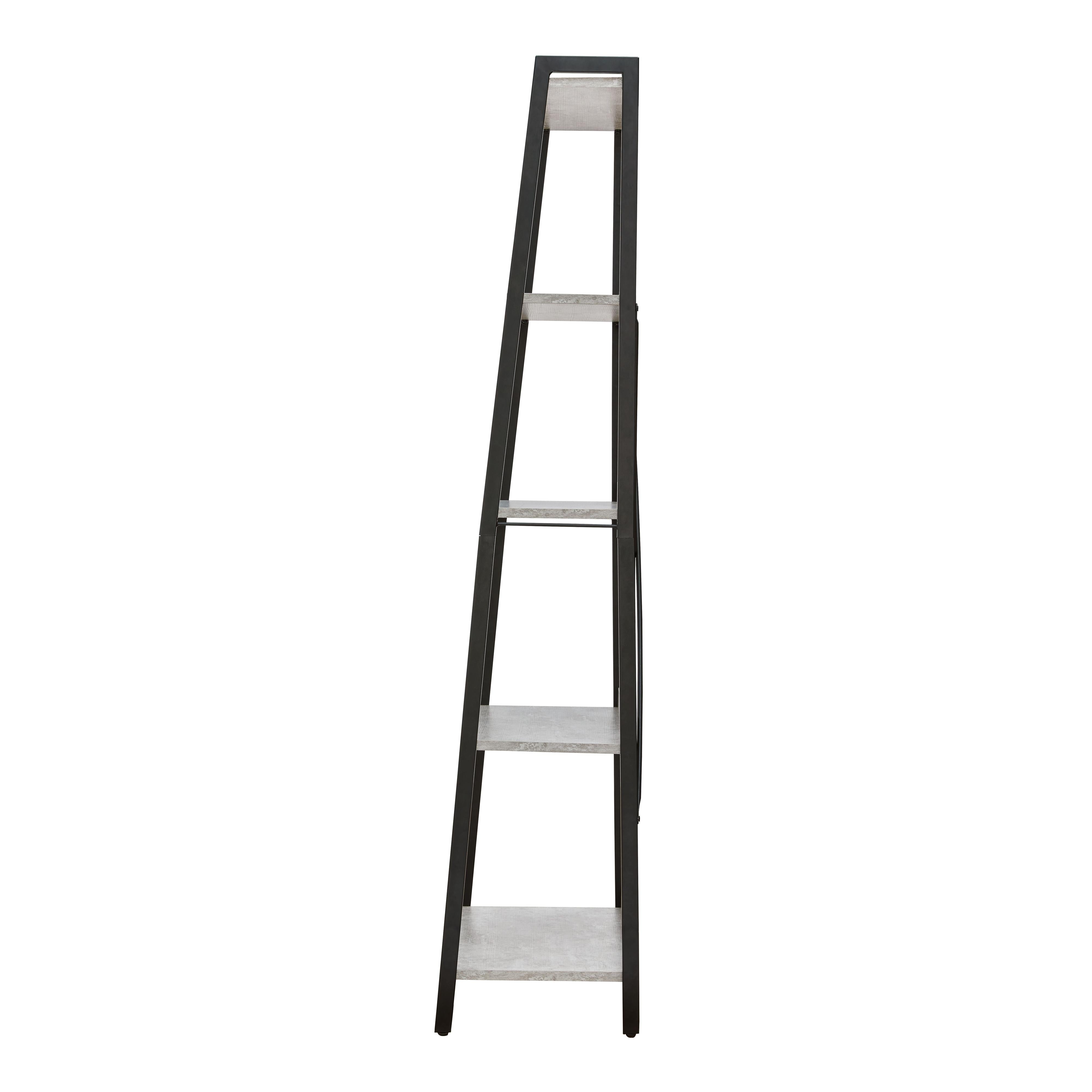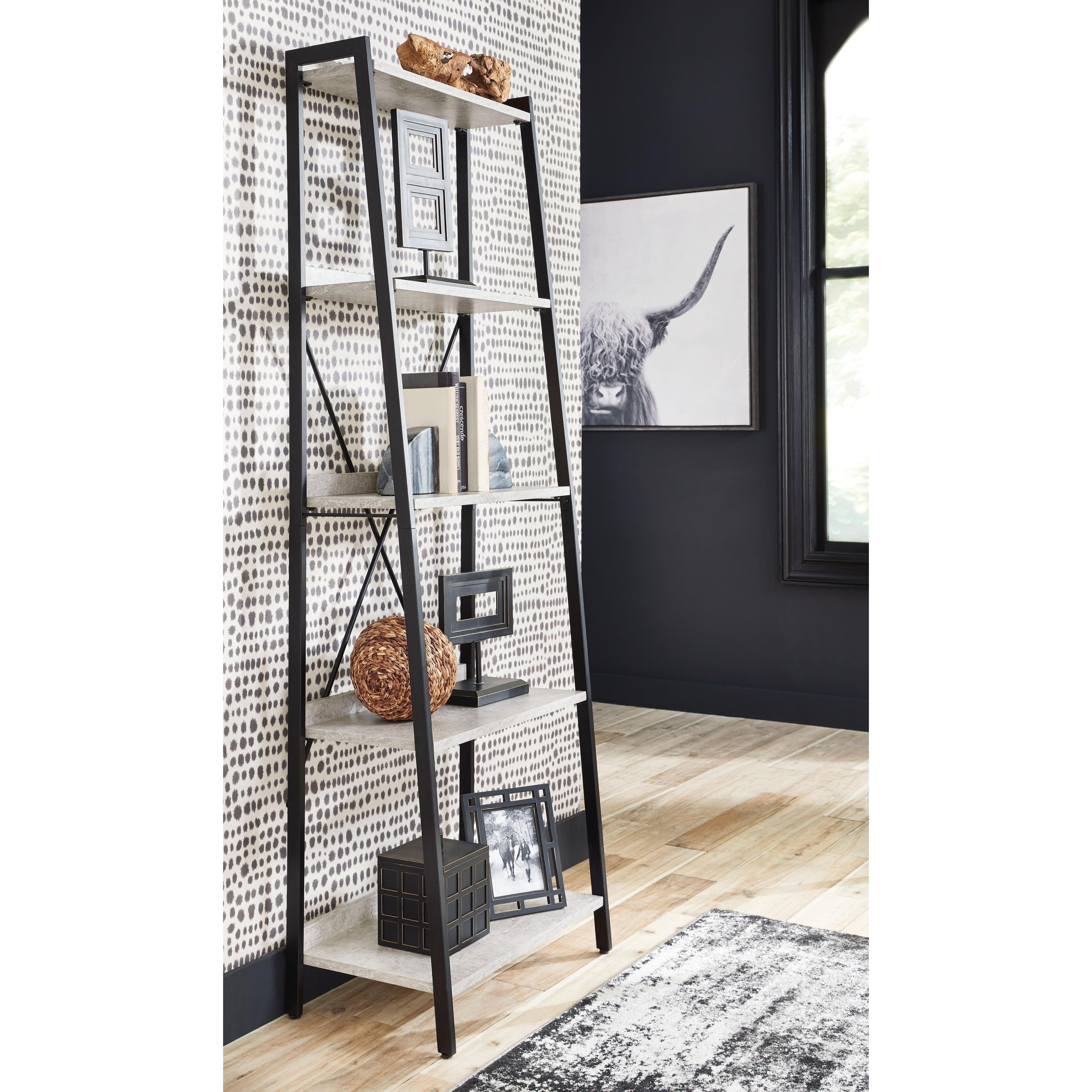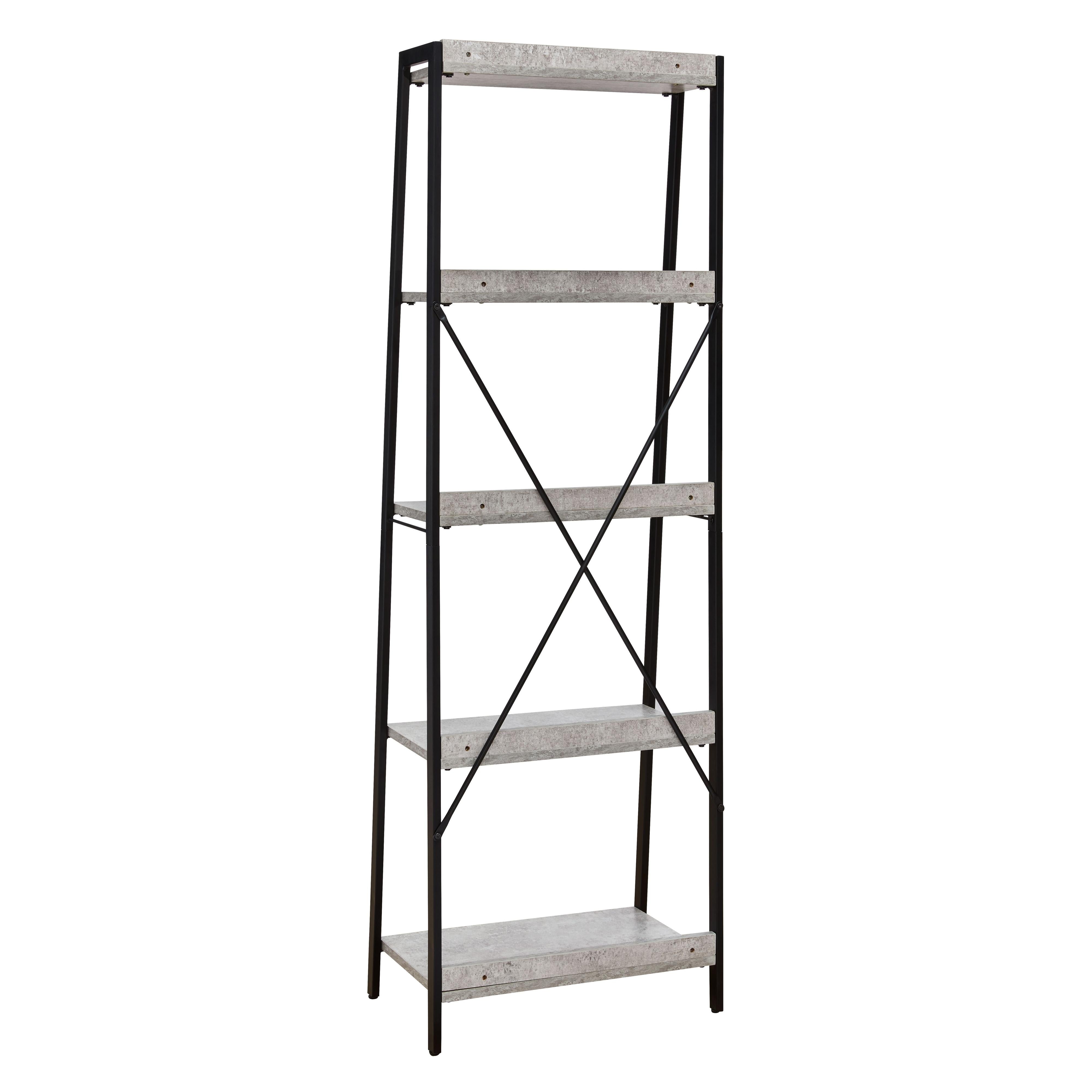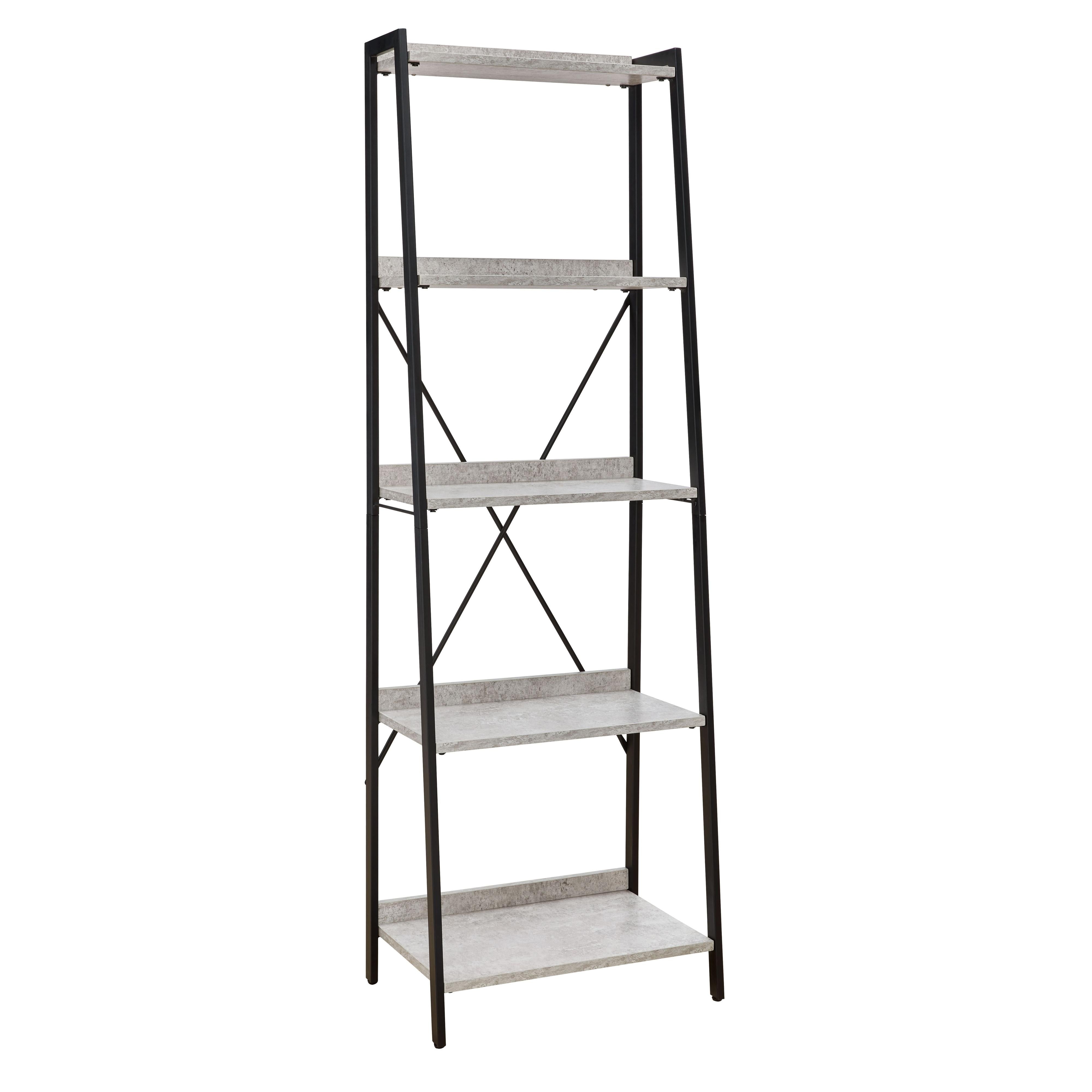 Casual linear style is ideal to keep your home office aesthetic appealing and clean. This bookcase features an architectural look with its faux concrete melamine shelves and a metal base in a dark pewter-tone finish, for the perfect balance of crisp and cool. Melamine is an increasingly popular choice for table surfaces. It can be manufactured to resemble wood grain but with kid-friendly durability.