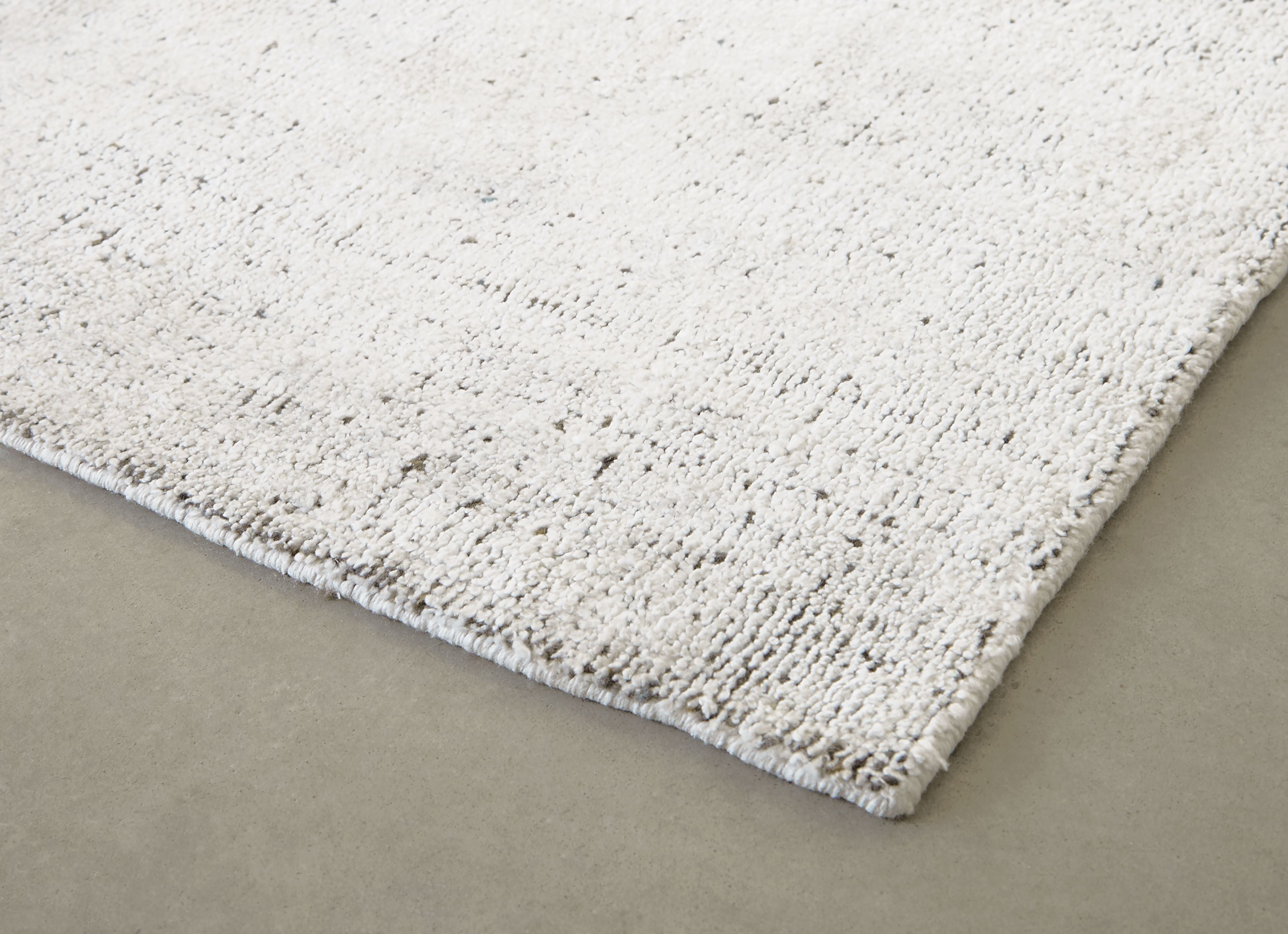 This area rug showcases a hand-knotted abstract design in ivory and charcoal that exemplifies timeless styles of elegance, comfort and sophistication. Constructed of a hand-spun viscose and wool blend, it's a soft and striking addition to any interior.