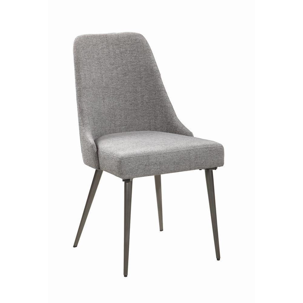 Inspire a modern motif with the clean lines and retro-like feel of this armless dining chair. mid-century modern design gets a contemporary makeover with sleek monochrome hues. thin, tapered legs in a gunmetal grey finish add a sophisticated and open feel. grey textured fabric covers the back and seat cushions, with a wingback-like silhouette. charming details and design create a clean piece that looks great around small and large tables.