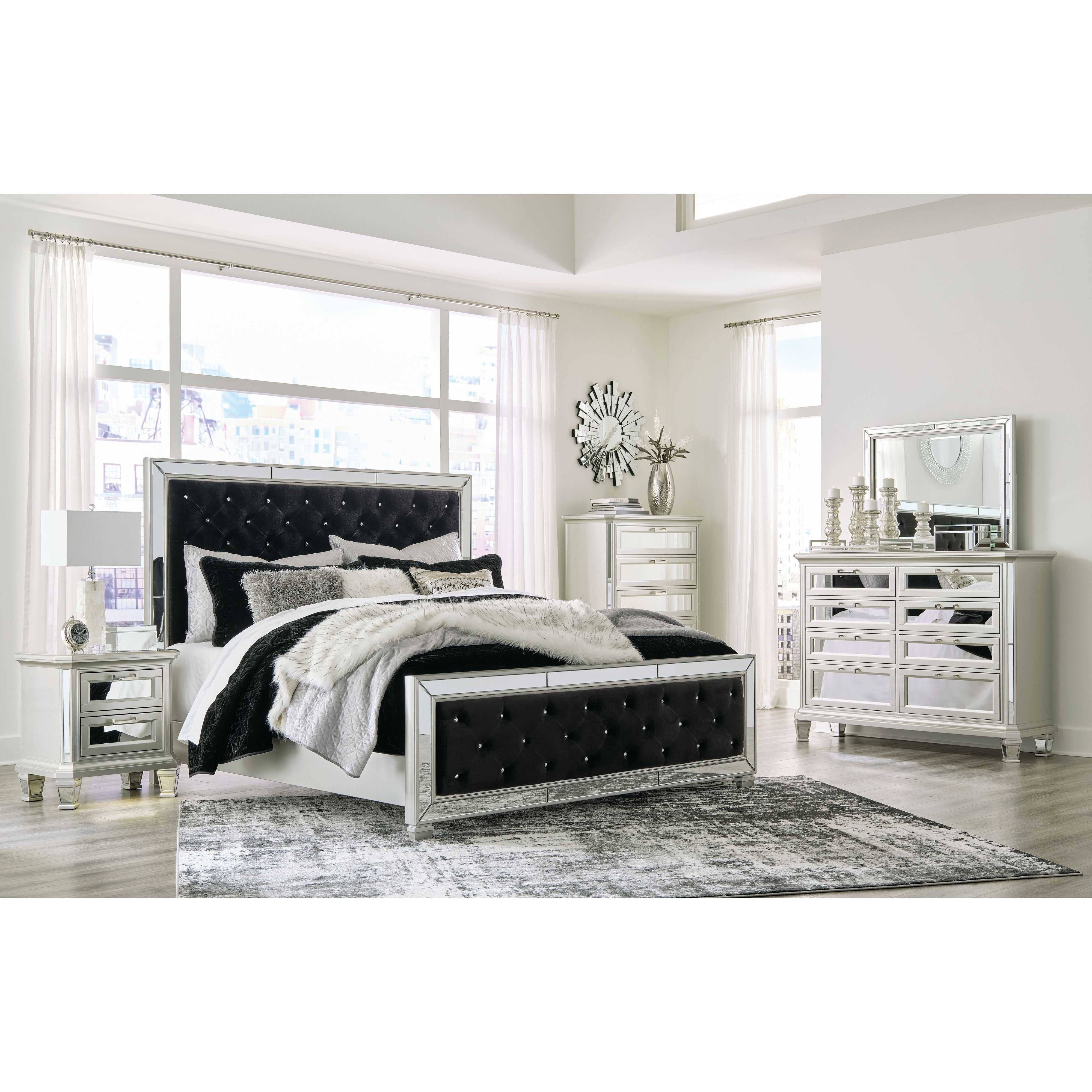 Seamlessly complete your bedroom with this striking queen upholstered bed. The dynamic piece has a cool tufted black velvet design. With faux crystal buttons on the headboard and footboard to bring the boldness, this contemporary piece effortlessly takes your room to the next level. Contemporary Luxe design. Made with solid wood frames, veneer, engineered wood substrates and cast resin components. Metallic silver-tone finish with inset beveled mirror accents. B758-54/57/56/58 is a tufted black velvet panel bed with faux crystal buttons. Champagne colored stylish wing bed with geometric cushion design, LED back lights and textural inset panels for added luster. B758-154/156/157/158 high styled contemporary tufted bed with storage. Made with engineered wood frames, foam cushions and a beautiful black velvet cover. Spacious footboard storage box with fully lined interior bins and spring-tension stay arms to support the lid. Side storage bins are also fully lined and feature removable lids. Platform slats eliminate the need for a foundation box spring. Nightstand features an LED night light and 110V power supply with dual USB charging ports. Drawers feature sanded and sealed drawer boxes with dovetailed construction and metal ball bearing side glides.