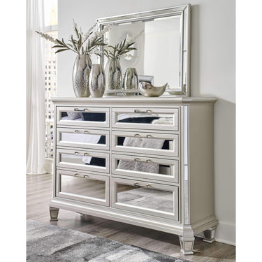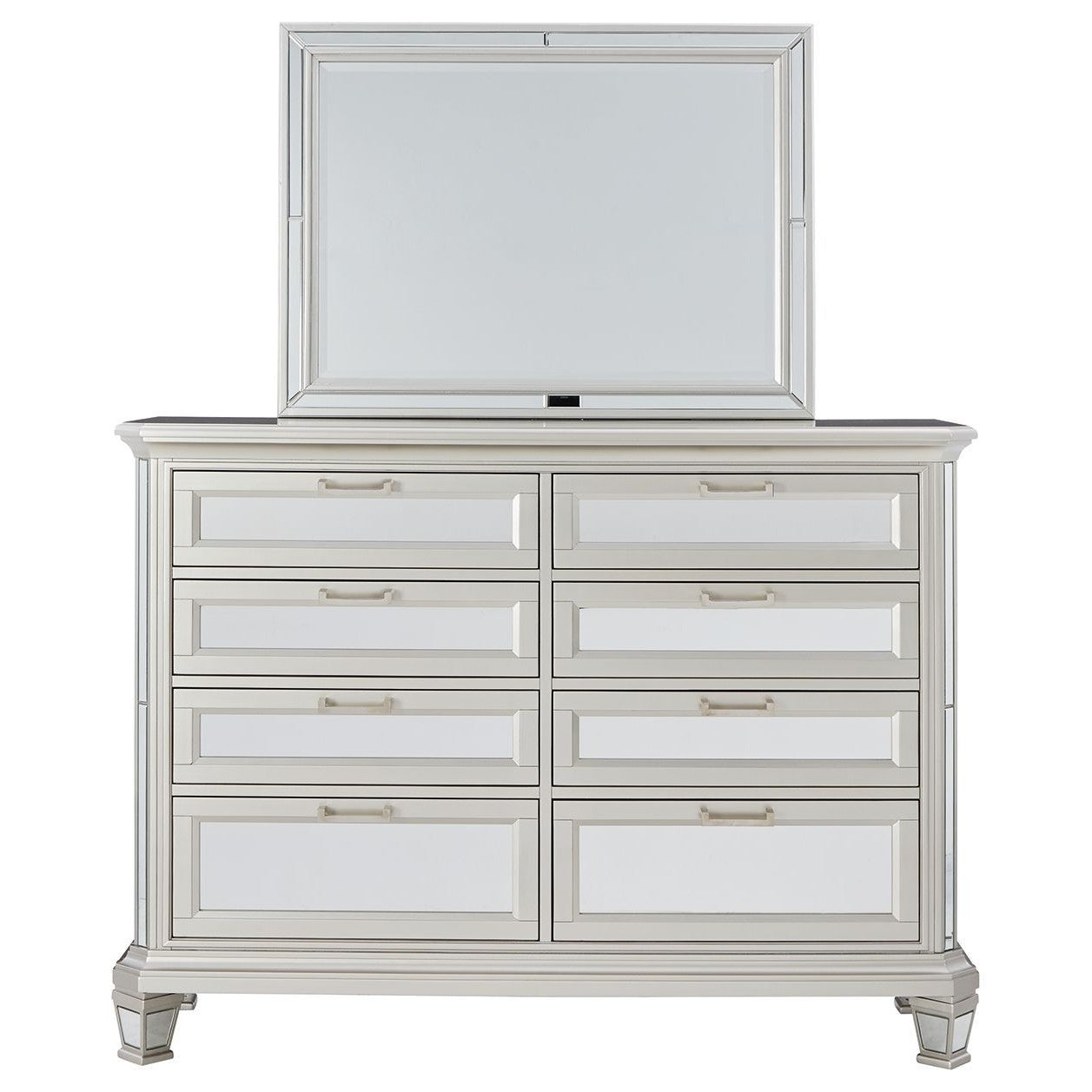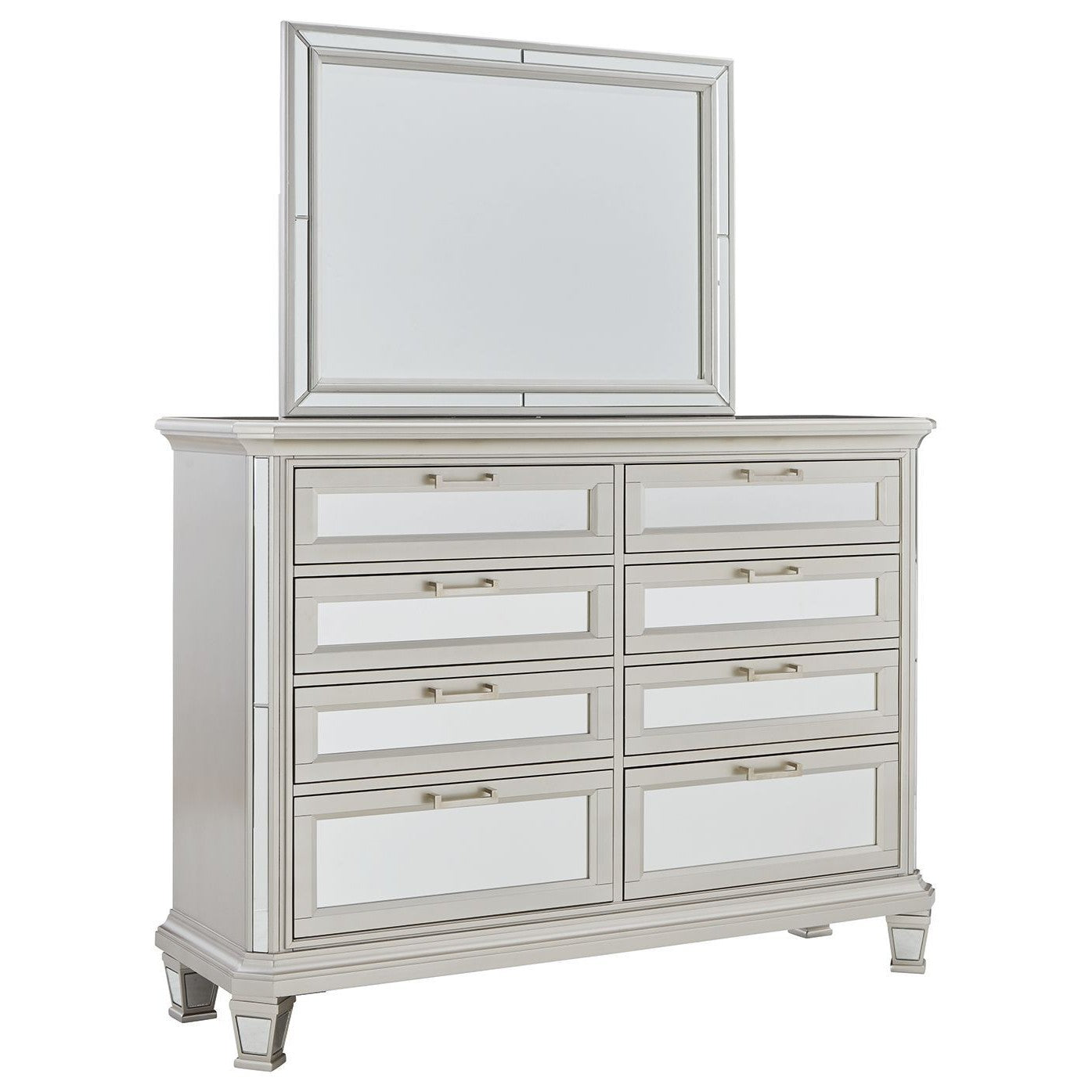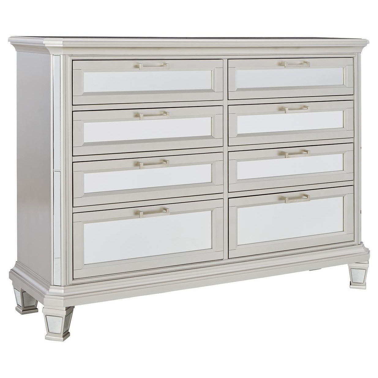 Seamlessly complete your bedroom with this striking dresser with mirror. Its metallic silvertone finish is bold on its own, while inset beveled mirror accents take this dynamic piece to the next level. Eight smooth-gliding drawers allow for the perfect balance of function and forward-thinking design, and a jewelry tray inside each top drawer of the dresser adds the finishing touch. Contemporary Luxe design. Made with solid wood frames, veneer, engineered wood substrates and cast resin components. Metallic silver-tone finish with inset beveled mirror accents. B758-54/57/56/58 is a tufted black velvet panel bed with faux crystal buttons. Champagne colored stylish wing bed with geometric cushion design, LED back lights and textural inset panels for added luster. B758-154/156/157/158 high styled contemporary tufted bed with storage. Made with engineered wood frames, foam cushions and a beautiful black velvet cover. Spacious footboard storage box with fully lined interior bins and spring-tension stay arms to support the lid. Side storage bins are also fully lined and feature removable lids. Platform slats eliminate the need for a foundation box spring. Nightstand features an LED night light and 110V power supply with dual USB charging ports. Drawers feature sanded and sealed drawer boxes with dovetailed construction and metal ball bearing side glides.