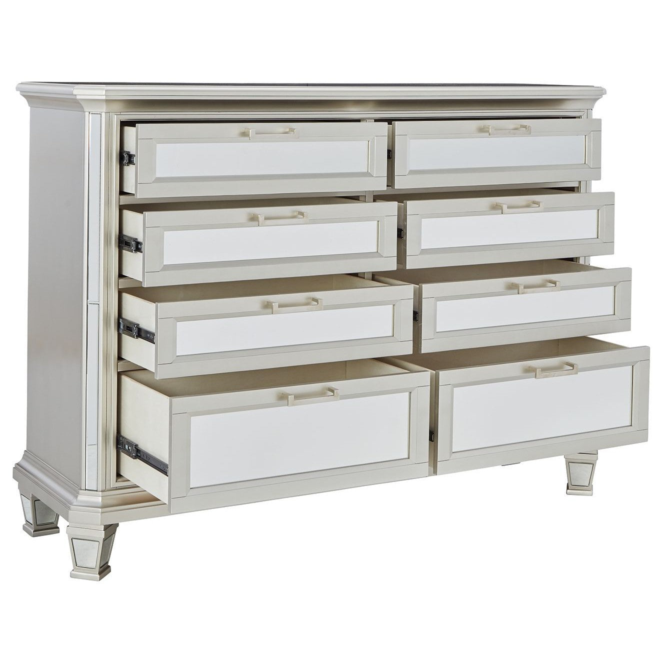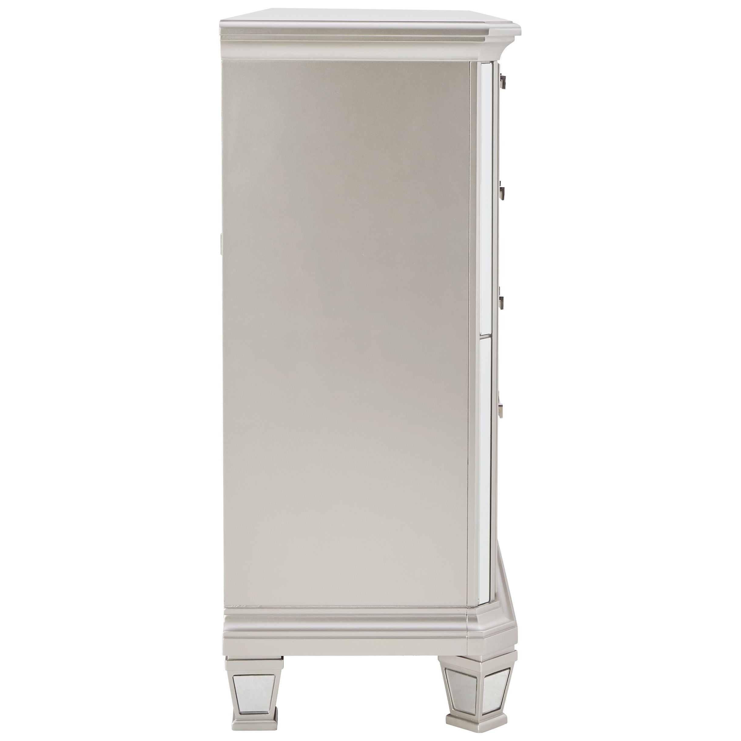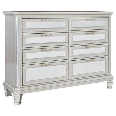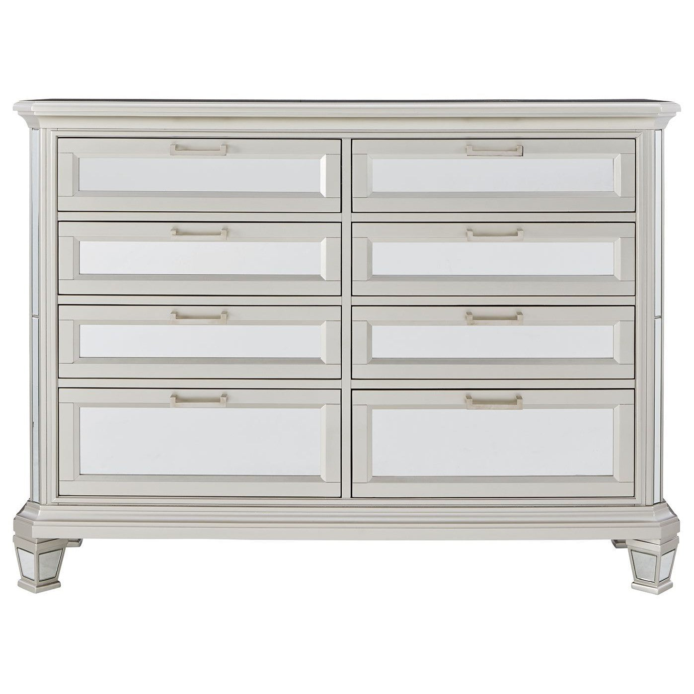 Seamlessly complete your bedroom with this striking dresser. Its metallic silvertone finish is bold on its own, while inset beveled mirror accents take this dynamic piece to the next level. Eight smooth-gliding drawers allow for the perfect balance of function and forward-thinking design, and jewelry trays inside each top drawer of the dresser add a finishing touch.